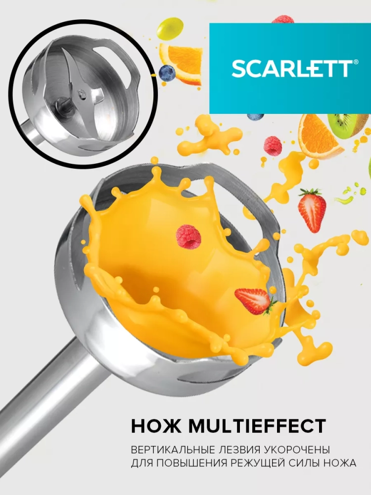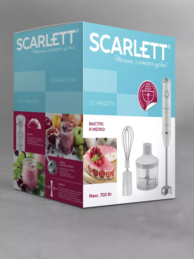 Погружной блендер Scarlett SC-HB42F91 сочетает в себе функционал блендера, миксера и измельчителя. Утонченный белый корпус небольшого веса и мощный мотор созданы специально для удобной работы и компактного хранения даже на самой маленькой кухне. 14 плавно переключающихся скоростных режимов дают свободу выбора и полет фантазии для приготовления самых изысканных блюд на каждый день. Ножи MULTIEFFECT способны за считанные секунды расправится с самыми твердыми продуктами питания. Погружная часть блендера выполнена из нержавеющей стали собственной марки STEEL PRO, что обеспечивает эффективное измельчение и смешивание продуктов любой температуры и консистенции.
