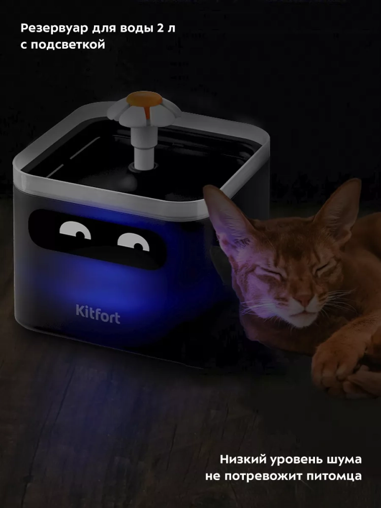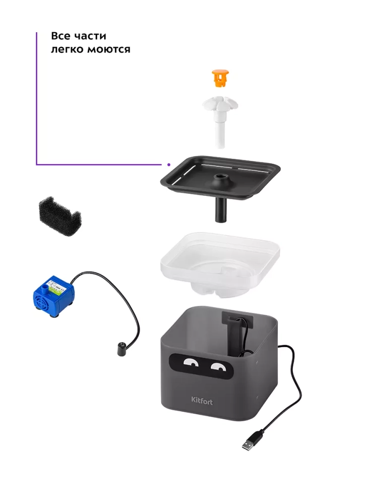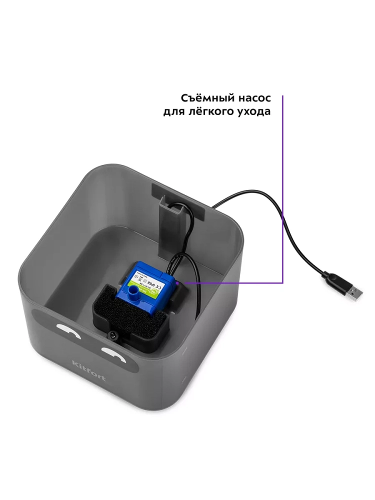 Фонтанчик для животных Kitfort KT-4047 — это устройство, обеспечивающее чистой не застоявшейся водой ваших питомцев. Водяной насос перекачивает воду из внутреннего резервуара в чашу для питья, откуда вода стекает обратно в резервуар. При этом вода проходит через фильтр, очищающий ее от шерсти, пыли и иных загрязнений. Когда капли воды выходят из фонтанчика и падают в чашу, происходит обогащение воды кислородом, что предотвращает застаивание воды.