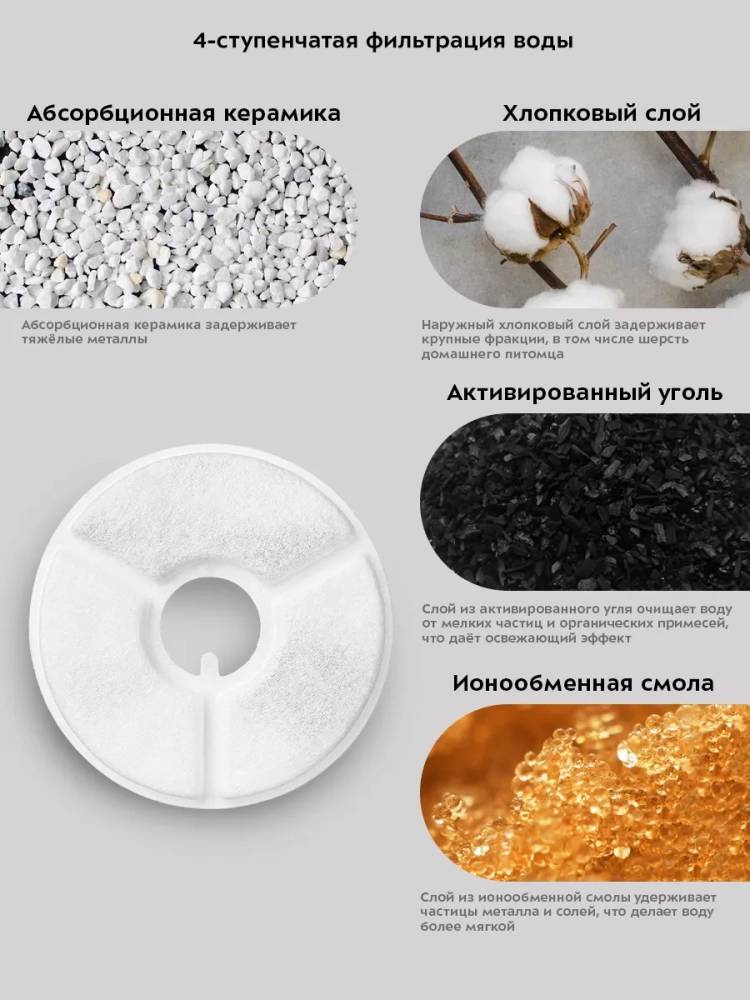 Фонтанчик Китфорт KT-4049 оснащен фильтром для воды. Фильтр задерживает мелкие частицы пыли, шерсть, мусор и очищает воду от тяжелых металлов и запахов. Устройство работает с минимальным шумом, так что не напугает вашего питомца. На корпусе устройства расположена шкала уровня воды, полупрозрачный корпус удобен для отслеживания уровня воды в устройстве.