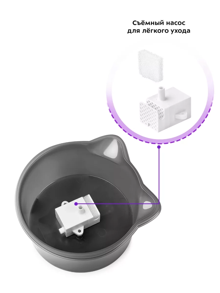 Водяной насос фонтанчика для питья съемный, что облегчает уход за устройством. Если уровень воды в резервуаре опустится ниже минимальной отметки, устройство автоматически выключится.