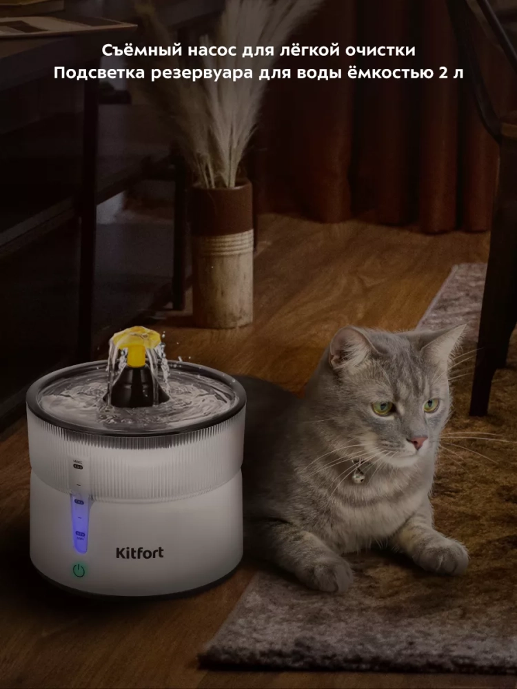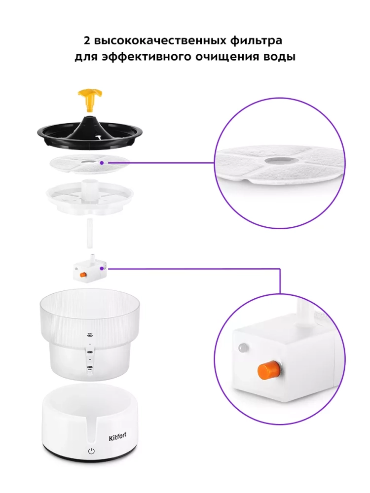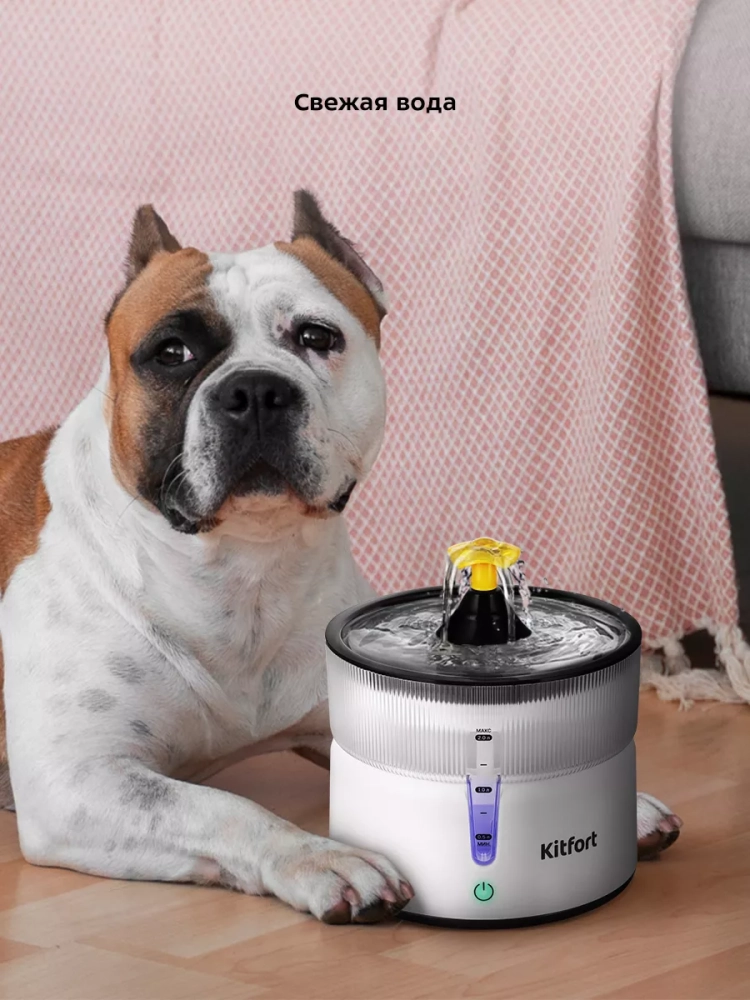 Фонтанчик для животных Kitfort KT-6244 — это устройство, обеспечивающее ваших питомцев чистой незастоявшейся водой. Водяной насос перекачивает воду из внутреннего резервуара в чашу для питья, откуда вода стекает обратно в резервуар через прорези в чаше. При этом вода проходит через два фильтра, которые смягчают ее и очищают от постороннего привкуса, запаха и загрязнений. Когда вода выходит из фонтанчика и подается в чашу, происходит обогащение воды кислородом.