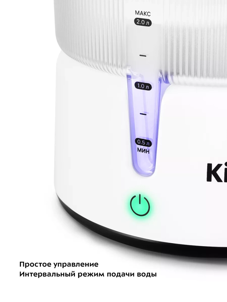 Фонтанчик KT-6244 оснащен двумя фильтрами. Поролоновый фильтр защищает насос от попадания внутрь крупных частиц пыли, мусора, шерсти. Резервуар для воды подсвечивается за счет индикатора на насосе, поэтому даже в темноте вы увидите устройство и не заденете его. Цвет индикатора на насосе покажет, что устройство работает нормально или вода в резервуаре закончилась. На резервуаре для воды есть прозрачная вставка со шкалой для отслеживания уровня воды в устройстве.