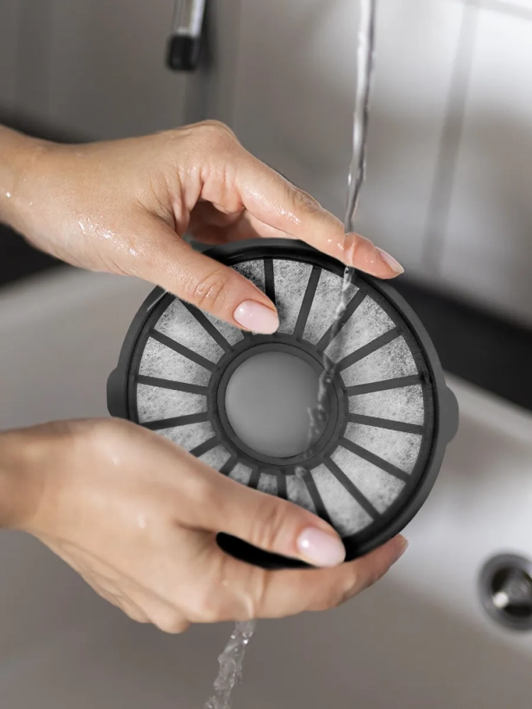 Фонтанчик KT-6440 оснащен фильтром из хлопкового волокна, керамических шариков, активированного угля и ионообменной смолы. Водяной насос фонтанчика для питья съемный, что облегчает уход за устройством. Резервуар для воды подсвечивается световым индикатором на насосе, поэтому даже в темноте вы увидите устройство и не заденете его. На резервуаре для воды есть прозрачная вставка для отслеживания уровня воды в устройстве.