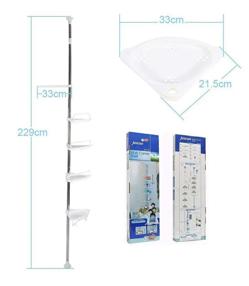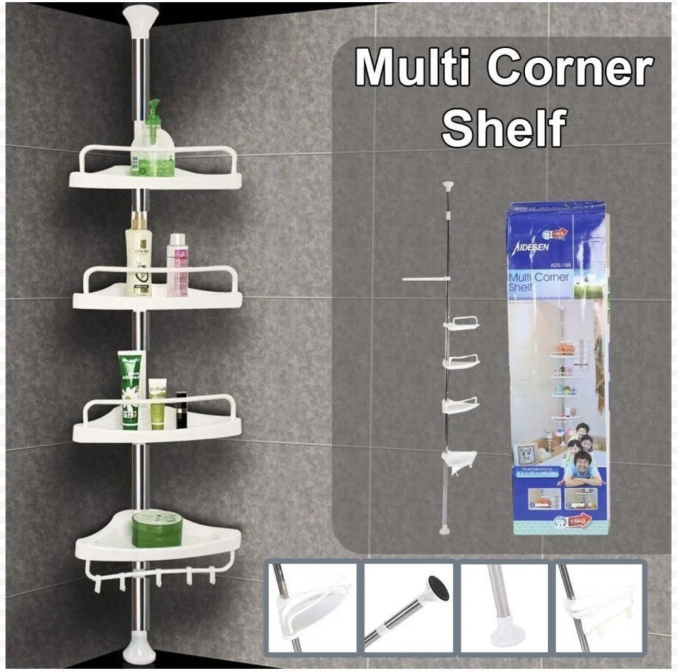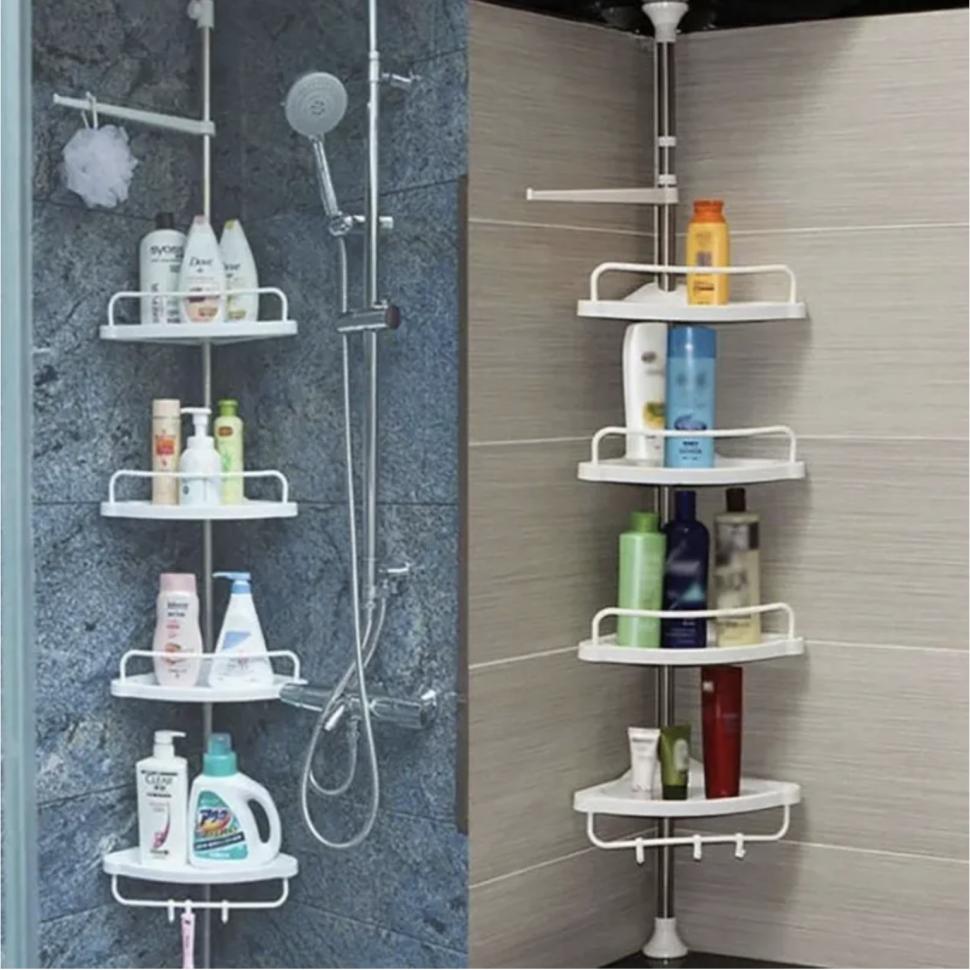 Угловая полка для ванной очень удобна для хранения косметики, мочалок, полотенец, детских игрушек и т.п. Угловая полка четырех ярусная с телескопической стойкой вместительна и занимает мало места, а все вещи на виду и под рукой. Преимущество такой полки в ванную - стойку можно регулировать по высоте от 1,2 м до 3.1 м и устанавливается без сверления в удобное место. На полочках предусмотрены отверстия для слива, что позволяет установить угловой стеллаж для ванной рядом с душевой лейкой. Угловая полка для ванны удобна в эксплуатации, т.к. у неё низкие бортики. На четырех угловых полочках достаточно места, чтобы разместить все необходимые вещи для ванной. Доставать с неё мыло и шампуни легко и просто. Угловая 4-ярусная полка белая из прочного пластика выдерживает большую нагрузку: каждая полочка до 5 кг для ванной комнаты заменит угловой шкаф. В комплект к угловой полки в ванную входят четыре крючка и штанга для полотенца. Благодаря своей универсальности,она станет отличным дополнением под любой интерьер и поможет Вам в организации пространства в Вашем доме или даже на даче, в бане.