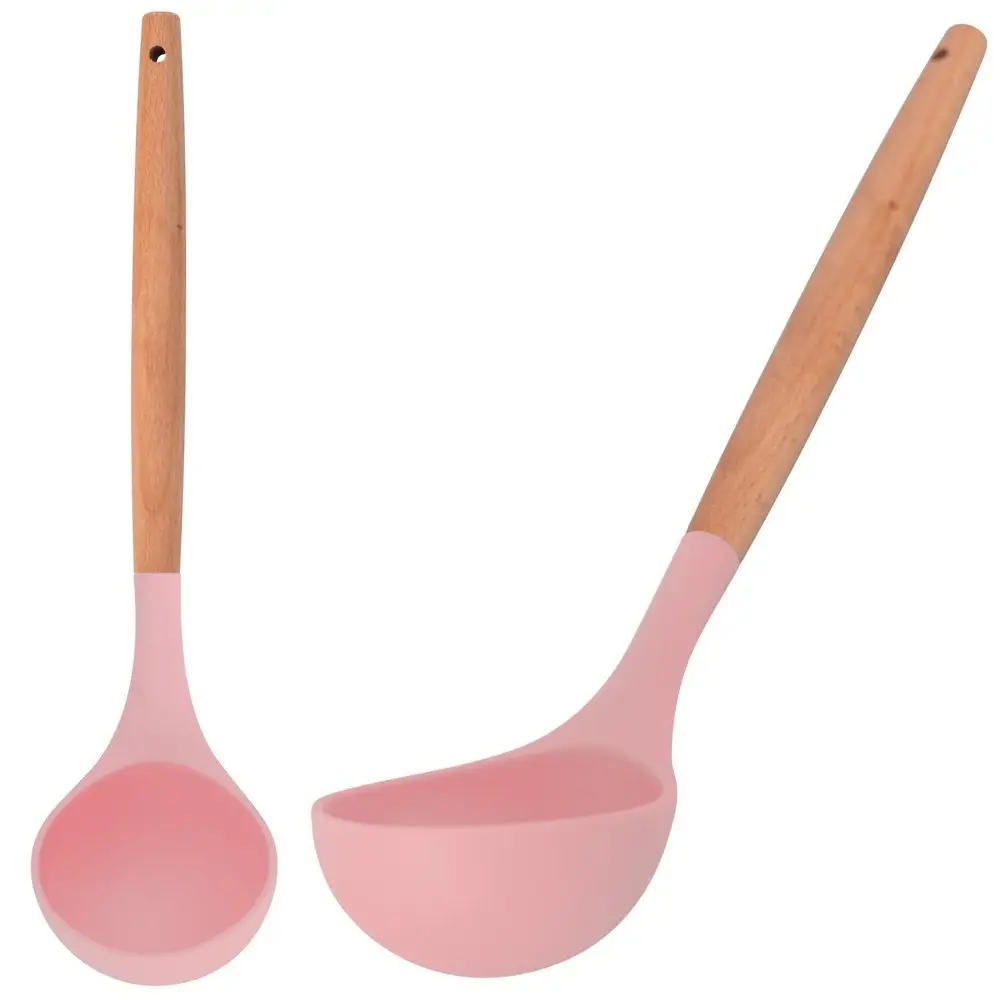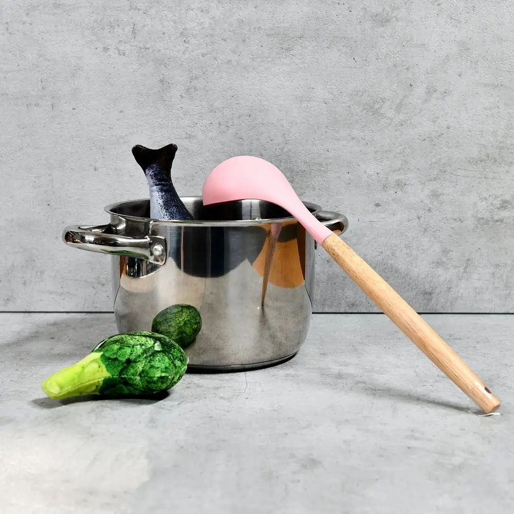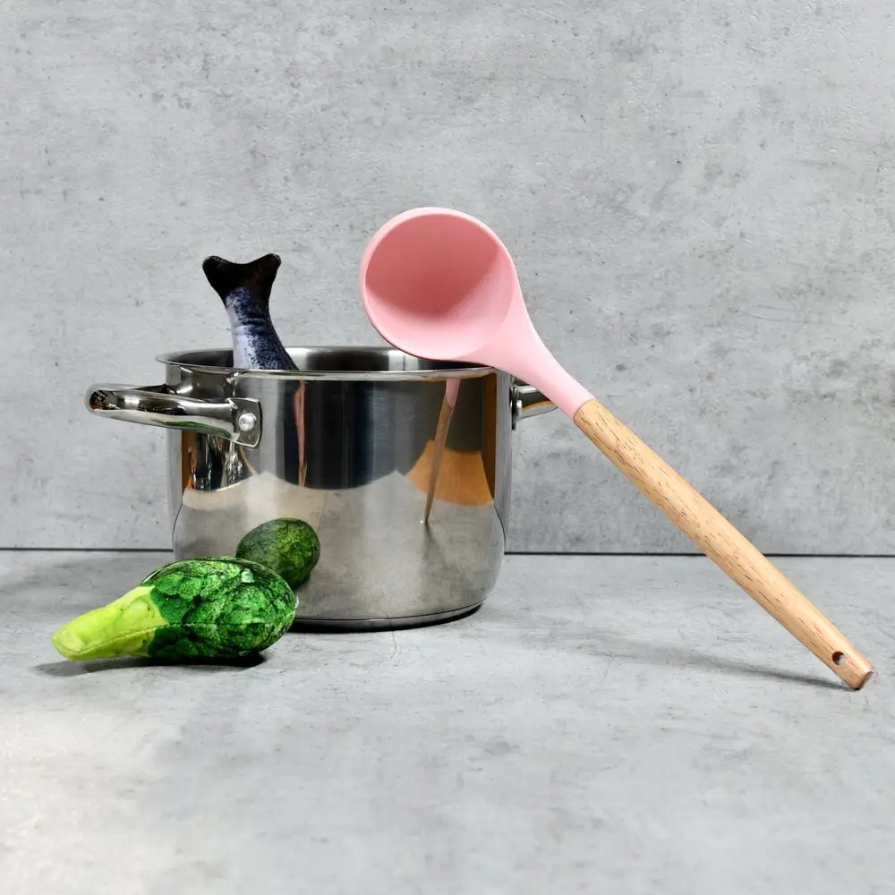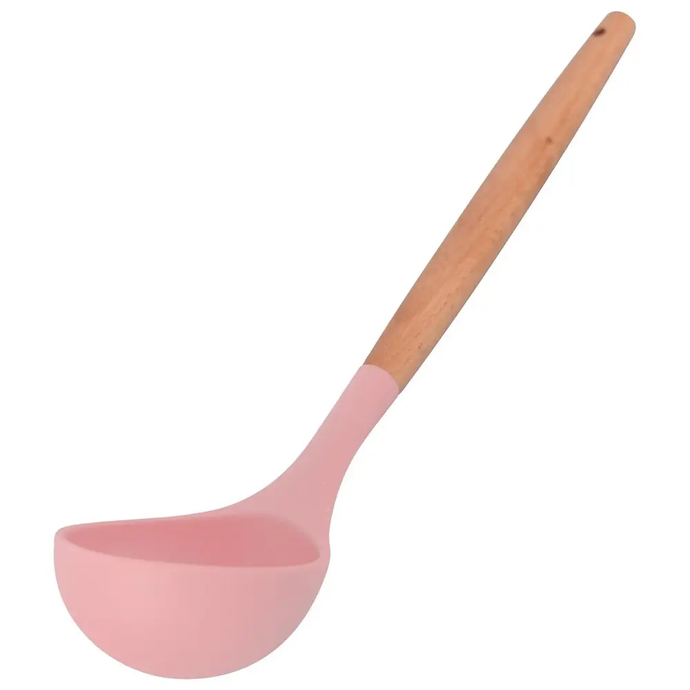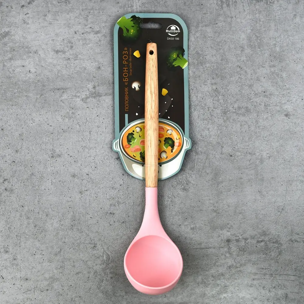 Изготовлено: рабочая часть из силикона, ручка из дерева. Общая длина 31 см. Ёмкость чаши половника 90 мл.