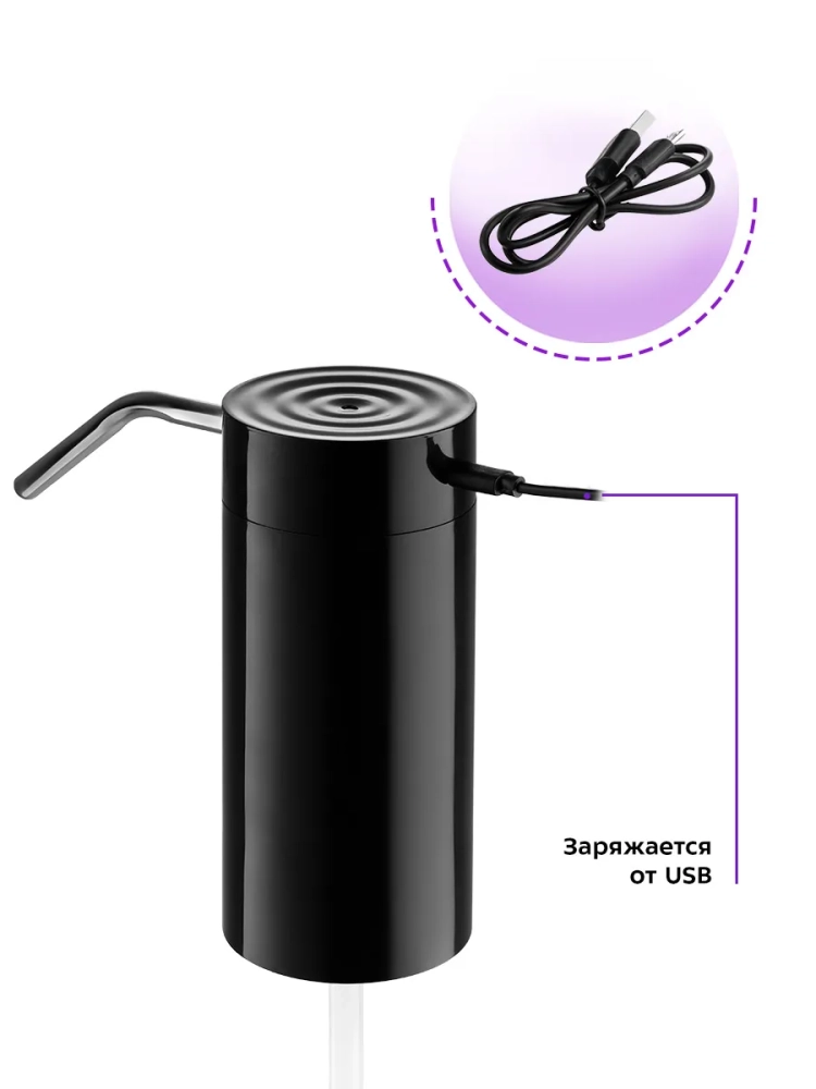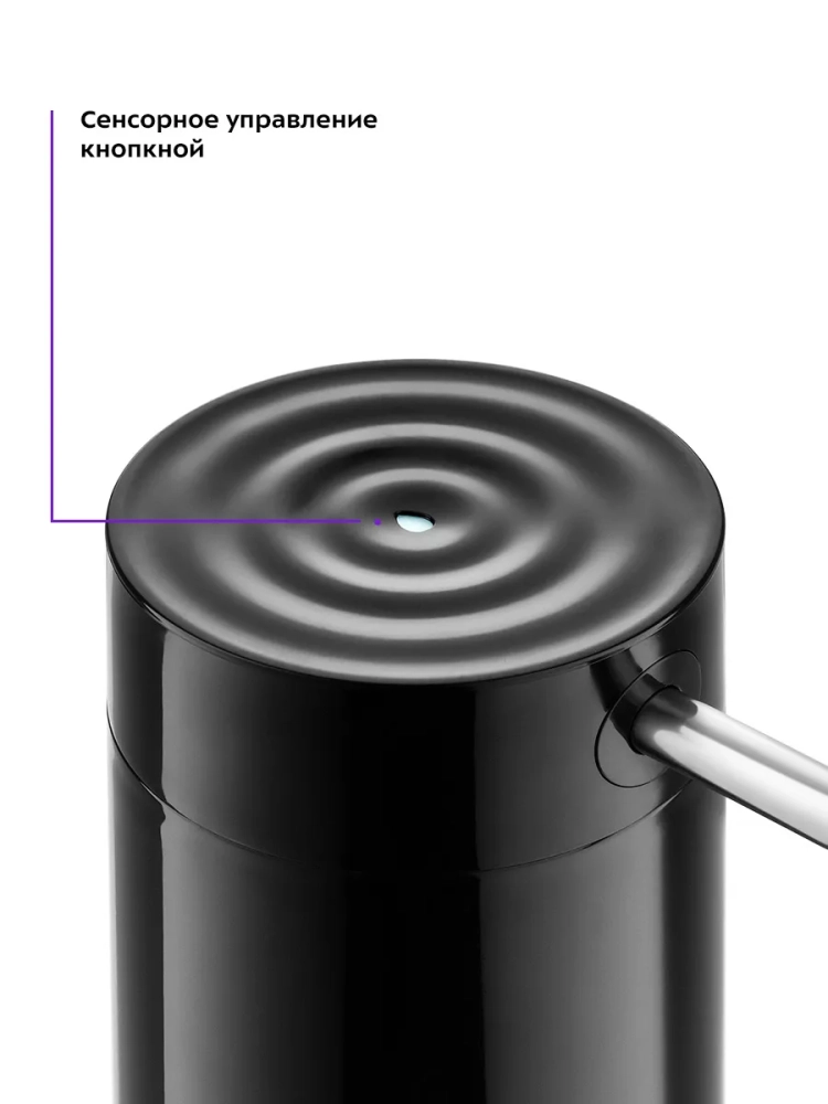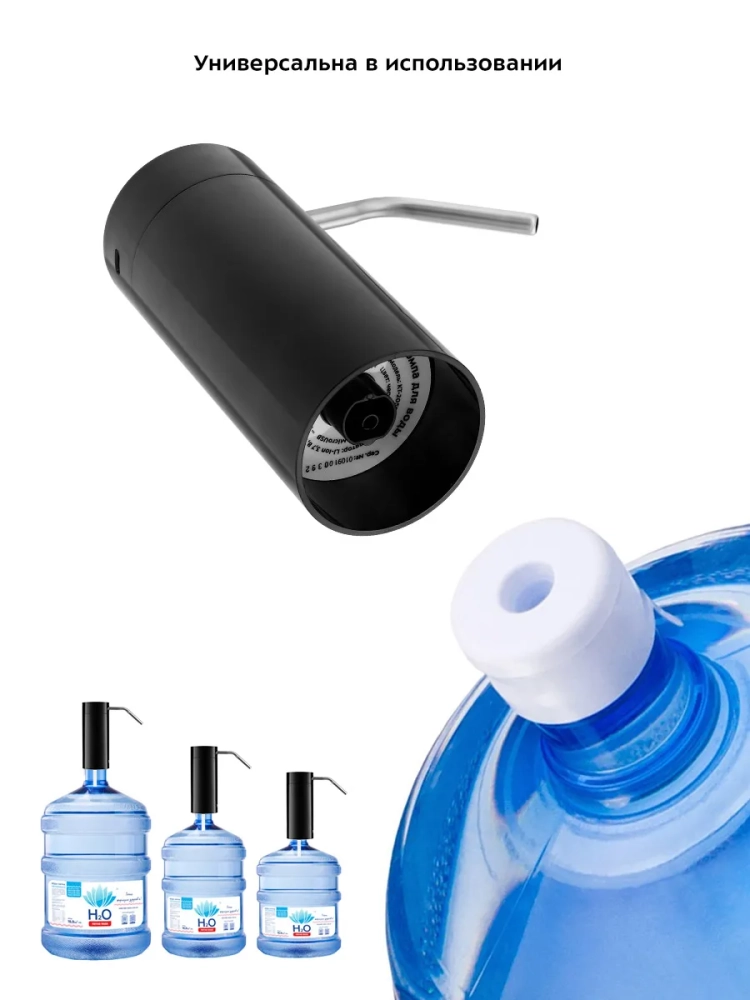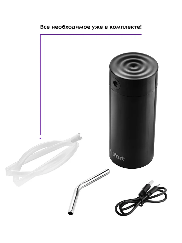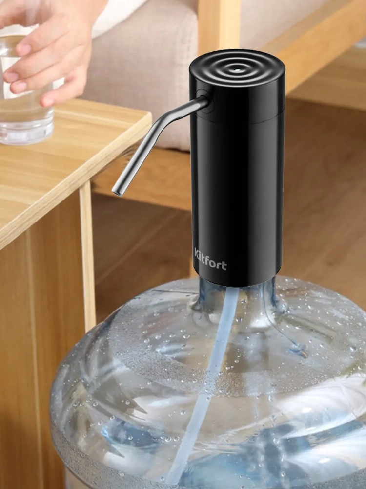 Электрическая помпа для воды Kitfort КТ-2059 очень проста в использовании, включается нажатием на сенсорную кнопку, работает от встроенного аккумулятора емкостью 2000 мА\*ч, и одного заряда хватает на прокачку до 150 литров воды. Помпа полностью автономная и является достойной заменой кулера. Модель Китфорт КТ-2059 универсальная в использовании, ее можно установить на бутыли емкостью 5, 10, 17 и 19 литров. Помпа изготовлена из безопасных материалов, корпус из пластика, всасывающий шланг из пищевого силикона, а трубка, из которой подается вода, из нержавеющей стали. Принцип действия механических помп основан на создании внутри резервуара избыточного давления воздуха, из-за чего вода вытесняется по трубке наружу. Для такого вида помп очень важно, чтобы корпус устройства плотно прилегал к горлышку бутылки. В отличие от механических помп, модель КТ-2059 не требует таких условий, что сильно расширяет способы применения. Например, вы можете опустить силиконовый шланг в кастрюлю или любую другую нестандартную емкость.