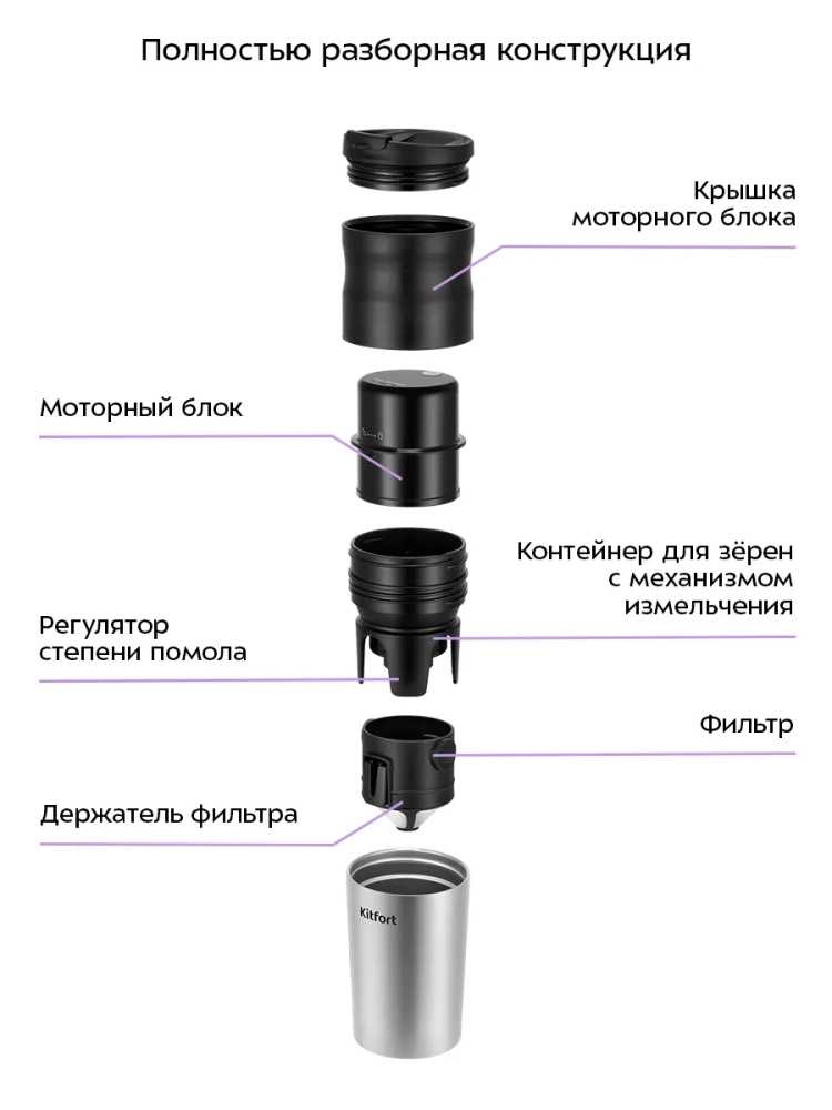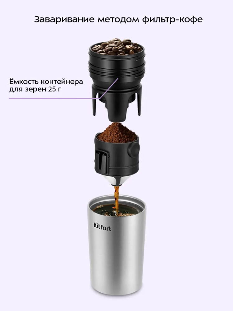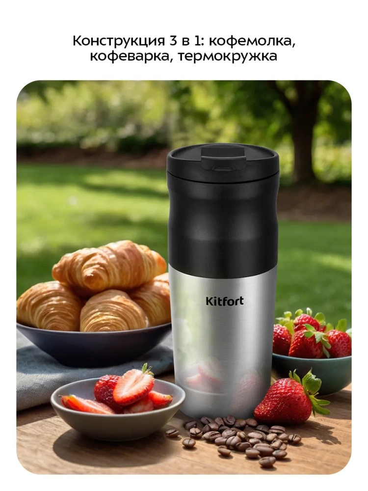 Портативная кофемолка «3 в 1» Kitfort KT-7534 совмещает в себе функцию не только кофемолки, но и капельной кофеварки, а также она позволяет брать кофе с собой в термокружке. Кофемолка является автоматической, она оснащена коническими жерновами из керамики. Прибор прост в использовании: измельченный кофе попадает в фильтр, после чего его заливают горячей водой, и кофе попадает в термокружку. Термокружку можно закрыть крышкой, в которой есть отверстие для питья.