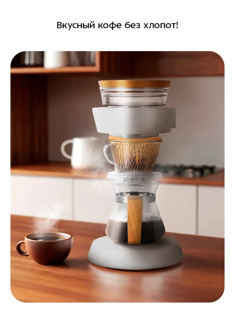 Портативная кофеварка-пуровер Kitfort КТ-7574 готовит ароматный черный кофе из молотого кофе. Особенность данной кофеварки заключается в воронке для пуровера. Пуровер (англ. pour over — лить сверху) — это метод заваривания кофе, при котором горячая вода проходит через молотый кофе, который находится в специальной воронке; горячая вода проливается вручную, однако данная кофеварка проливает воду сама.