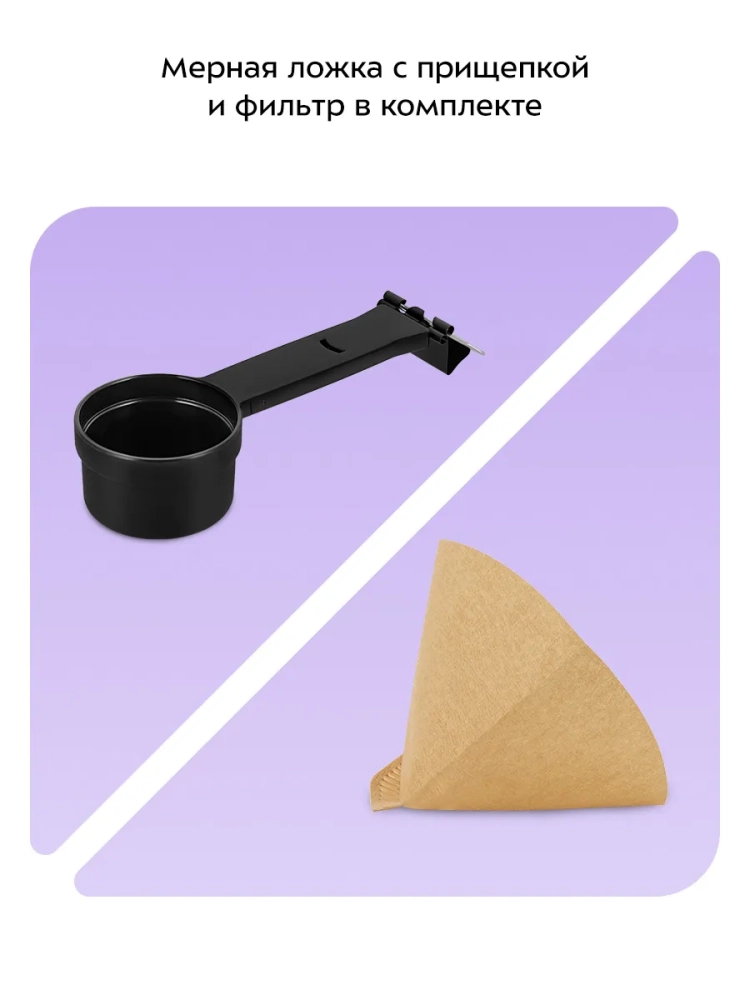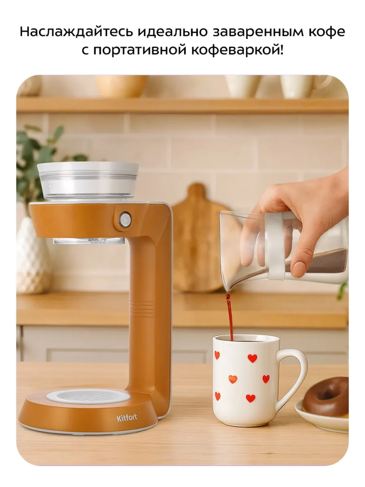 Портативная кофеварка-пуровер Kitfort КТ-7575 готовит ароматный черный кофе из молотого кофе. Особенность данной кофеварки заключается в воронке для пуровера. Пуровер (англ. pour over — лить сверху) — это метод заваривания кофе, при котором горячая вода проходит через молотый кофе, который находится в специальной воронке; горячая вода проливается вручную, однако данная кофеварка проливает воду сама.
