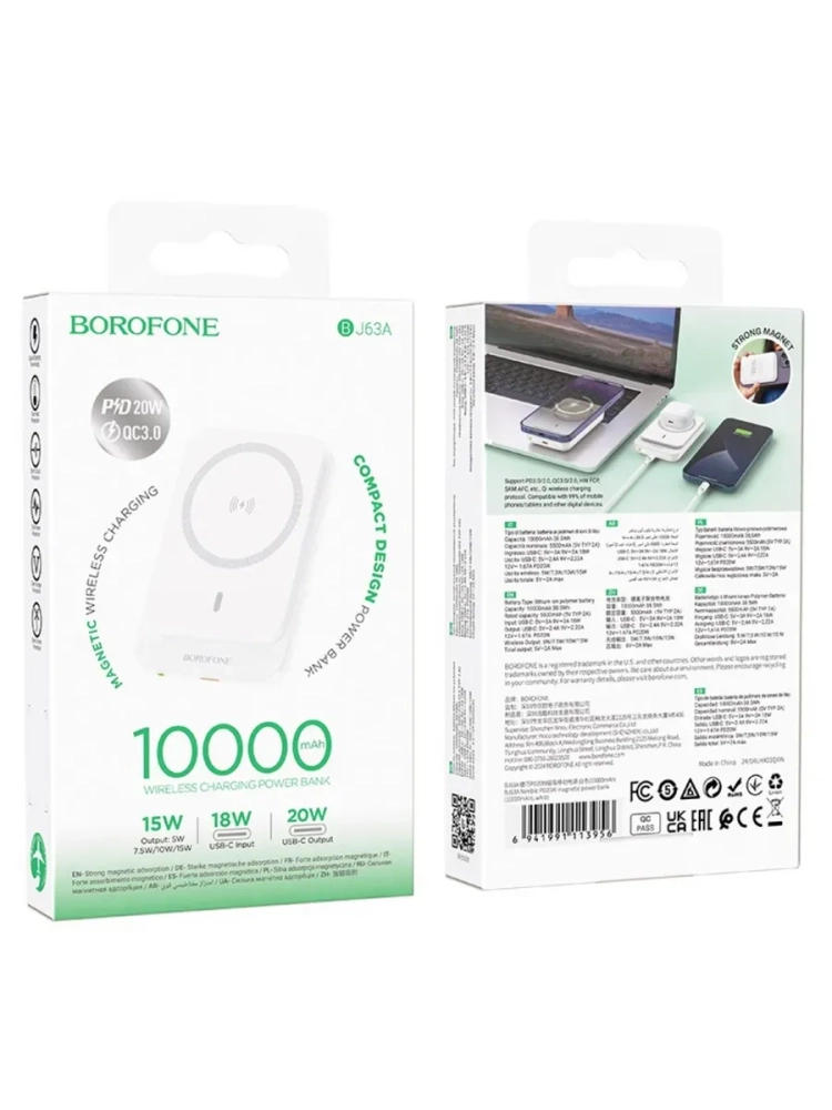 Повербанк максейф 10000 mAh BJ63A – это идеальный выбор для портативной зарядки iphone с функцией magsafe, а также для других устройств с беспроводной зарядкой. Этот повербанк для айфона поддерживает быструю зарядку по стандартам PD20W и QC3.0, что позволяет быстро восполнить энергией ваш смартфон.