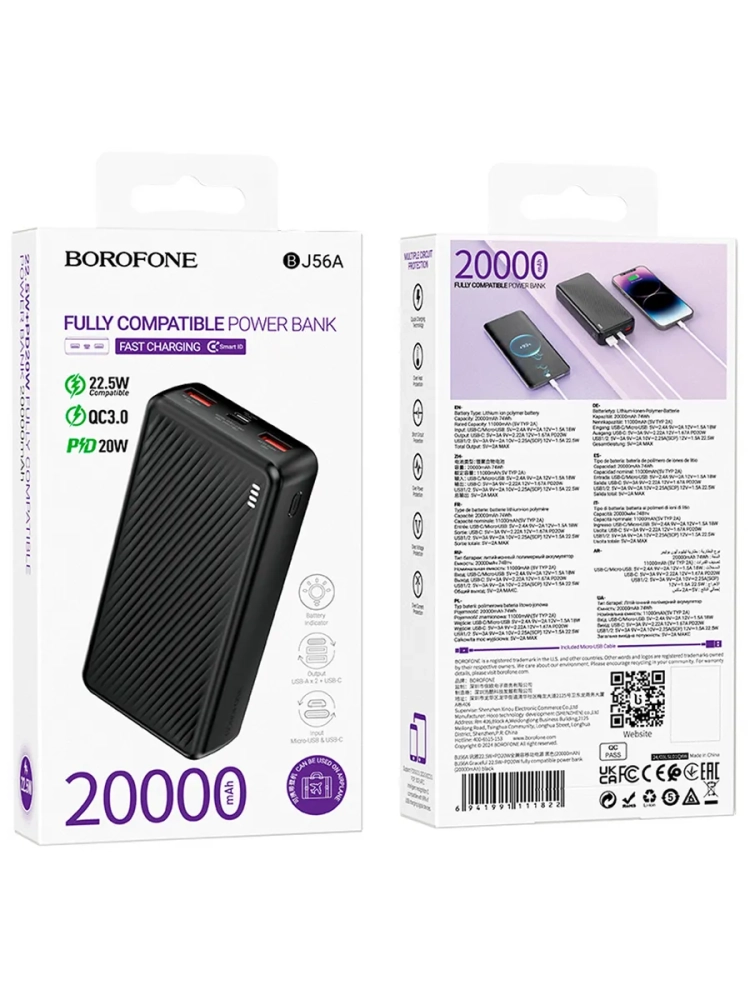 Мощный внешний аккумулятор емкостью 20000 мАч (74Wh) обеспечивает стабильную и быструю зарядку ваших устройств благодаря поддержке быстрой зарядки 22.5W (QC/FCP/SCP/AFC) и PD 20W. Идеален для смартфонов, планшетов, наушников и других гаджетов.