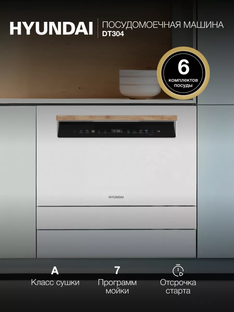 Посудомоечная машина Hyundai DT304 на 6 комплектов посуды - это надежный и функциональный прибор, который поможет вам сэкономить время и силы на мытье посуды.