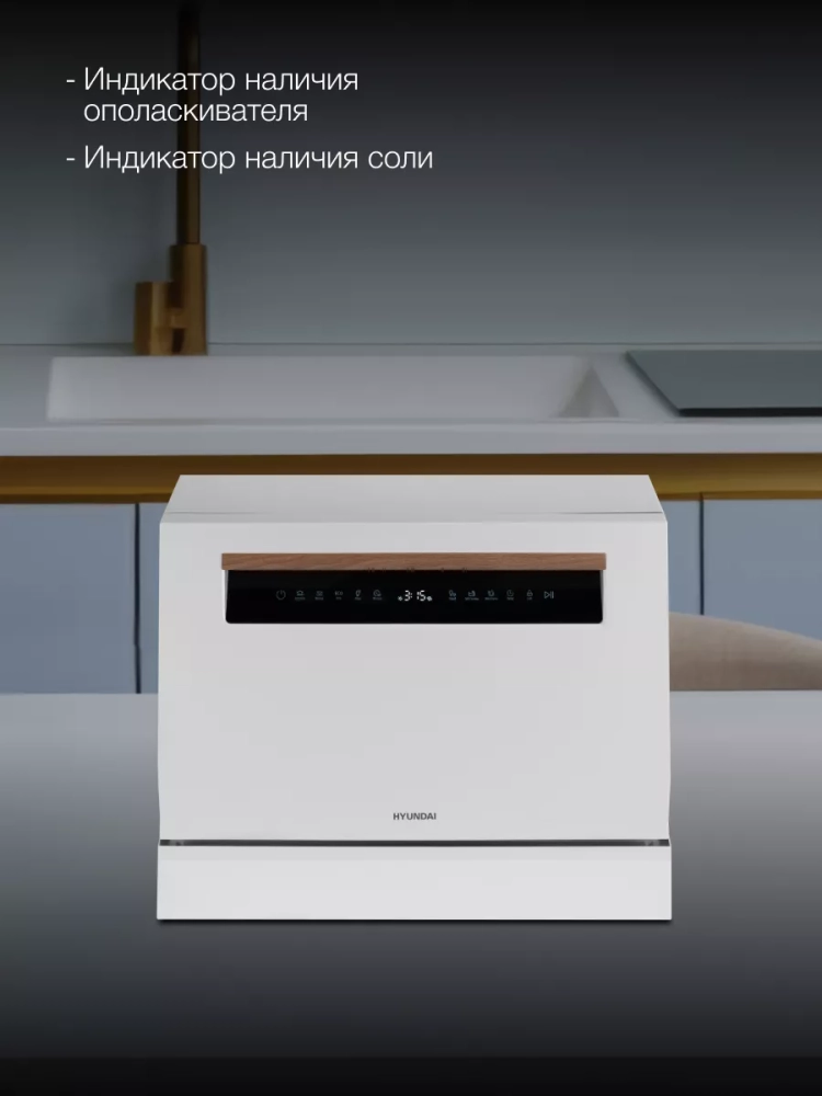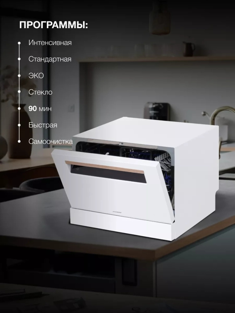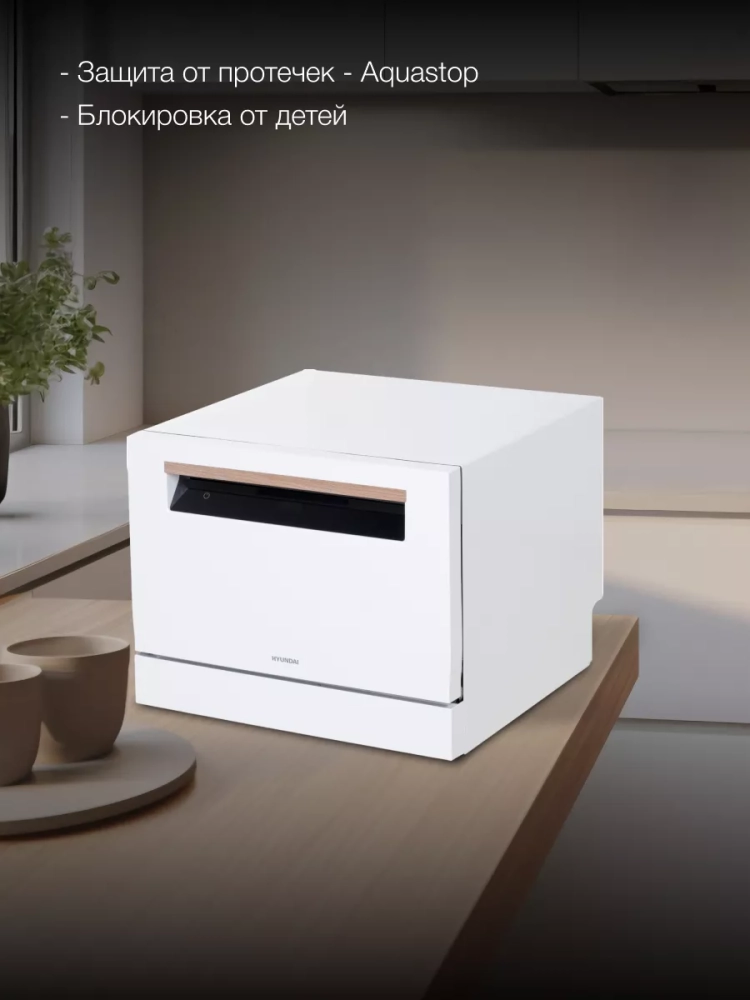 Посудомоечная машина Hyundai DT304 прекрасно впишется в кухонную обстановку небольшой квартиры или интерьер летнего дома. Компактные размеры позволяют установить ее на столе или встроить в нишу.