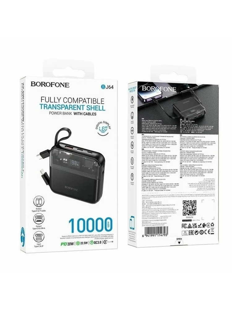 Портативное зарядное устройство Borofone BJ64 Distinct — это компактный и мощный повербанк с поддержкой быстрой зарядки и универсальными возможностями подключения. Оснащенный аккумулятором емкостью 10 000 мАч (36Wh), он позволяет эффективно заряжать смартфоны, планшеты и другие мобильные гаджеты. Компактные размеры (84×80×25 мм) и вес 198 г делают этот мини повербанк удобным для переноски в кармане или сумке, что особенно важно в поездках. Павербанк предлагает разнообразные входные и выходные интерфейсы для удобства пользователей. Входные разъемы включают 18W Lightning и Type c что позволяет быстро пополнять заряд самого пауэрбанка. Предусмотрены USB-A 22.5W и Type-C PD20W, обеспечивающие высокую скорость передачи энергии. Встроенные Type-C и iPhone кабели также поддерживают выходные параметры до 22.5W, делая этот powerbank удобным для зарядки без дополнительных проводов. Дополнительное удобство обеспечивает встроенный дисплей, который показывает уровень заряда паурбанка в реальном времени, помогая вовремя подзаряжать девайс. Технологии быстрой зарядки Power Delivery и Quick Charge 3.0 гарантируют максимальную скорость, сокращая время ожидания. Системы защиты от перегрева, короткого замыкания и скачков напряжения делают этот внешний аккумулятор безопасным для ваших гаджетов. Borofone BJ64 Distinct — это портативная зарядка с высокой мощностью и множеством разъемов, которая станет незаменимым аксессуаром для владельцев iPhone, Android и других мобильных устройств.