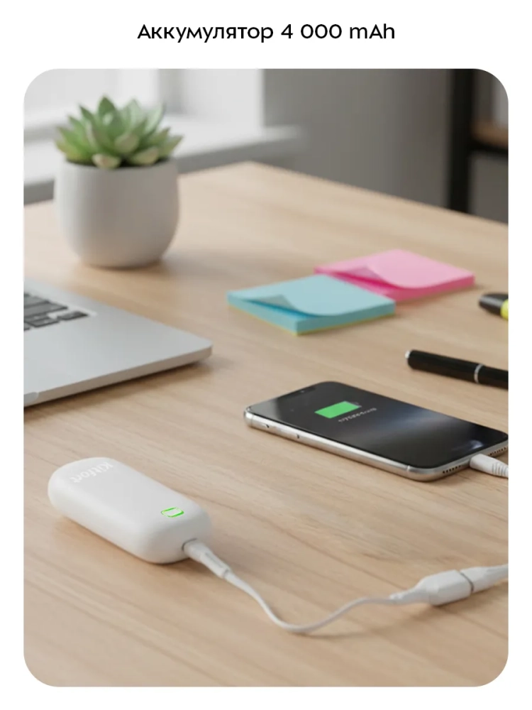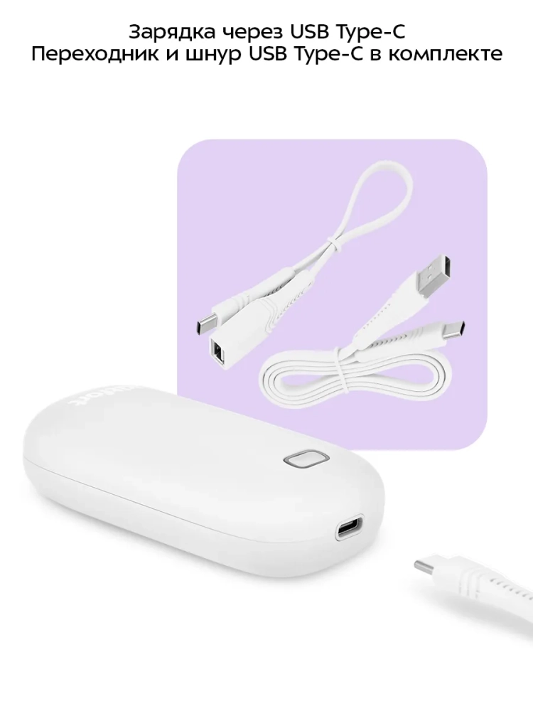 Для зарядки аккумулятора в комплект входит шнур USB Type-C, который присоединяется к блоку питания с выходными параметрами =5 В, 2 А (в комплект не входит) или к стороннему источнику питания (например, компьютеру). Грелка также сама может использоваться для зарядки других устройств и гаджетов: в комплекте предусмотрен переходник для зарядки с разъемом USB Type-C. Выходной ток 2 А позволит быстро зарядить любое устройство.
