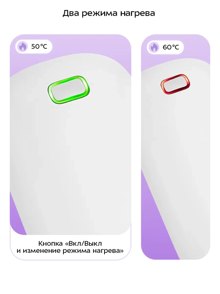Повербанк-грелка KT-2721 отличается простым управлением. Включение и выбор температуры нагрева осуществляется с помощью одной кнопкой на корпусе. У устройства 2 температуры нагрева: 50 и 60 °С. После установки необходимой температуры устройство разогревается в течение нескольких минут и поддерживает выбранную температуру от 3 до 4,5 часов в зависимости от выбранной температуры и температуры окружающей среды.