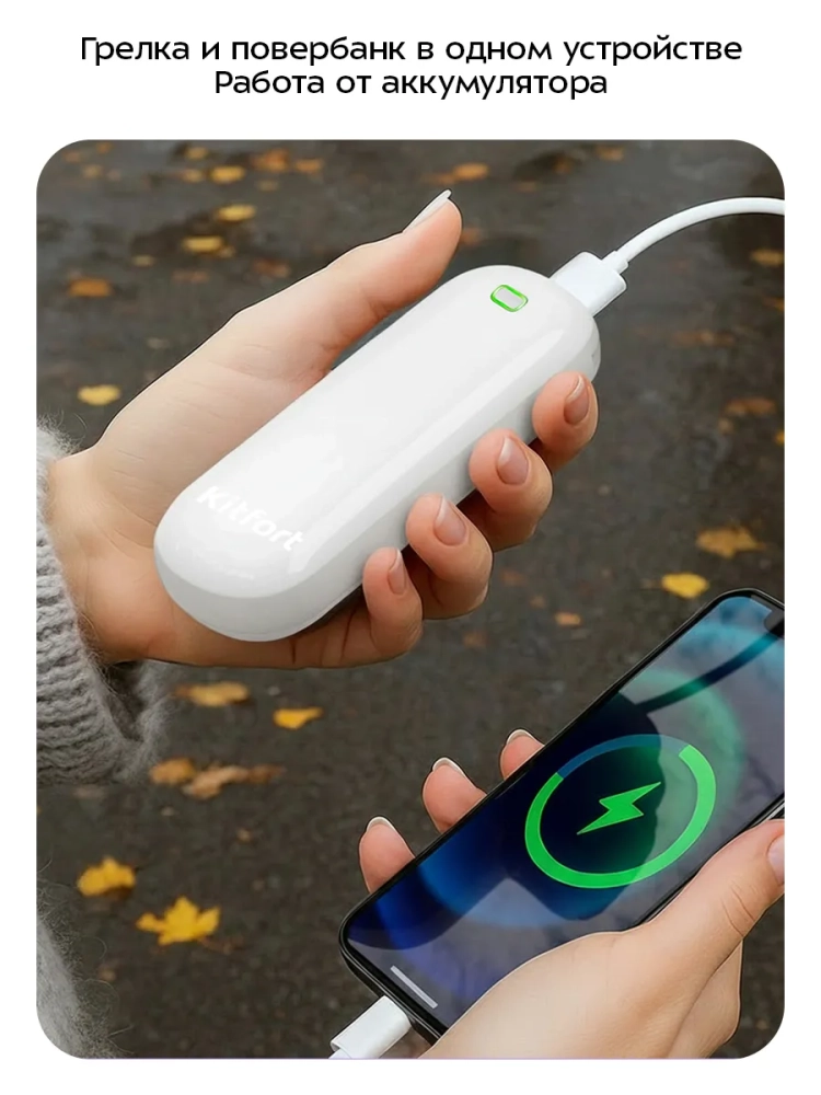 Повербанк-грелка Kitfort KT-2721 поможет согреть руки, ноги, прогреть обувь или одежду в холодное время года. Кроме того, устройство может работать как внешний аккумулятор (повербанк) для зарядки сторонних устройств. Прибор работает как грелка или как повербанк. Компактный размер грелки позволяет брать ее с собой и использовать в любом удобном месте.