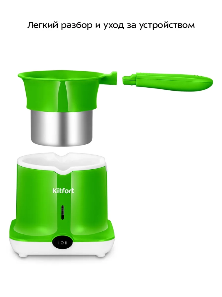 Устройство компактное и не займет много места на кухне. После использования ковш можно легко снять и очистить. Ручку ковша можно снять для компактного хранения. На дне корпуса есть отсек для хранения шнура, в который можно смотать излишки шнура электропитания, чтобы он не мешал на столе.