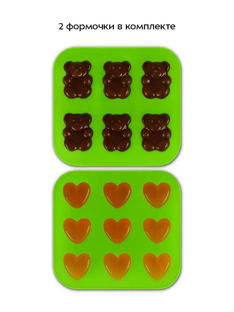 В комплекте идут две формы: одна в виде мишек и одна в виде сердечек. Формы выполнены из силикона, поэтому из них удобно извлекать продукты после охлаждения. Формы легко очищать и можно использовать многократно.