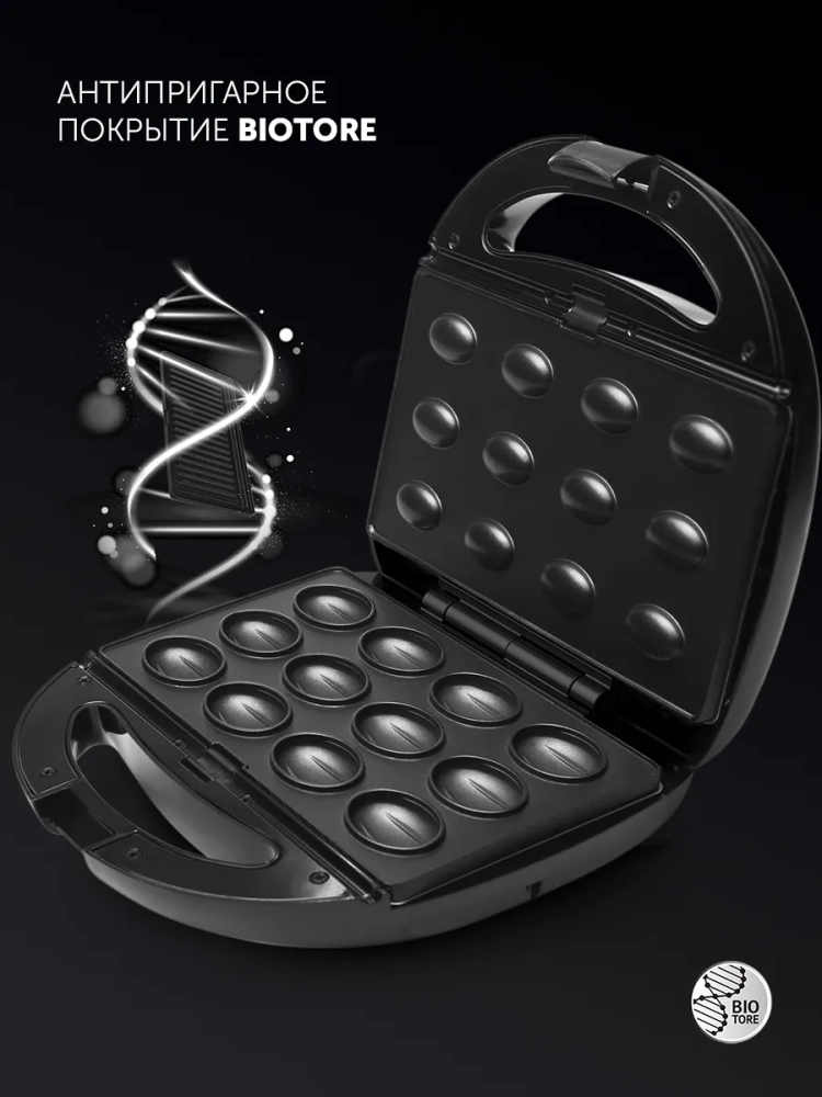 Многофункциональный прибор для выпечки. 5 пар съемных панелей: сэндвич, гриль, венская вафля, орешки, тонкая вафля. Автоматический контроль температуры. Антипригарное покрытие BIOTORE. Противоскользящие ножки. 2 индикатора работы. Мощность: 850 Вт.