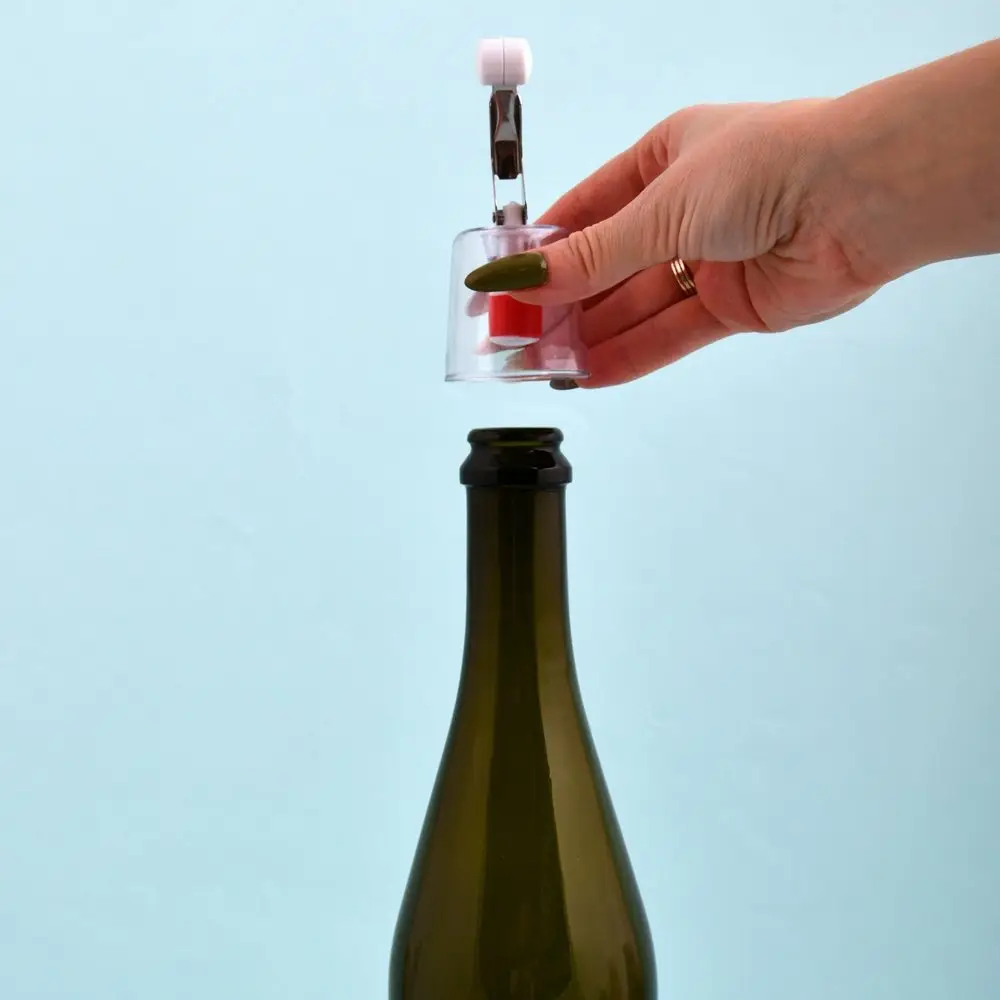 Вставить пробку в горлышко бутылки и отпустить вниз зажим.