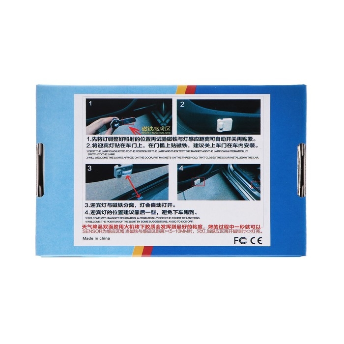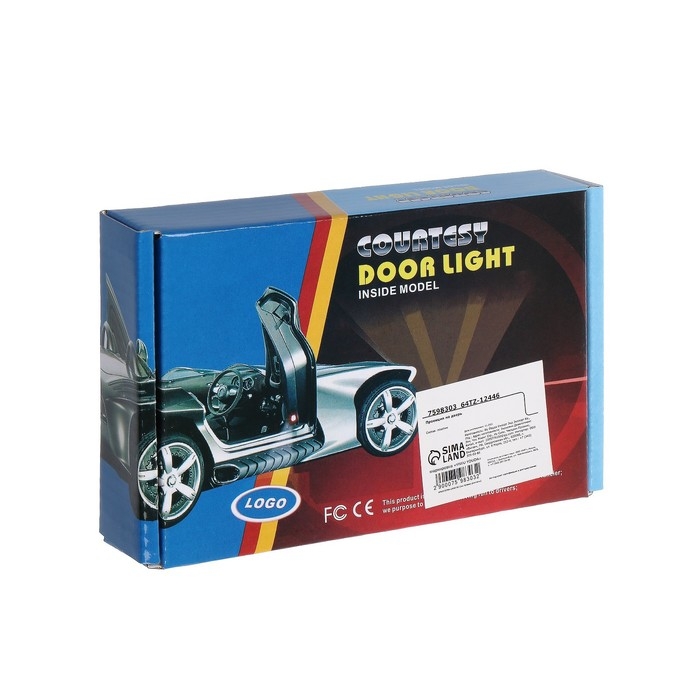Беспроводная светодиодная проекция на дверь. Она проектирует яркое изображение на полу, когда дверь открывается. Питание от 3 AAA батарей (не входят в комплект). Более широкий диапазон и ярче, чем обычный светильник, более заметный ночью. Простота установки, не требующая повреждения кузова. Отличный автомобильный эффект, он сделает ваш автомобиль привлекательным.