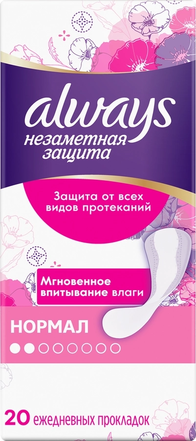 Ежедневные гигиенические прокладки ALWAYS «Незаметная защита Нормал» созданы для тех моментов, когда необходима дополнительная защита. Их технология нейтрализации запаха дарит непревзойденную свежесть и обеспечивает чувство уверенности. Ежедневные гигиенические прокладки ALWAYS «Незаметная Защита» – отличное средство защиты при всех видах выделений. Защита при всех видах выделений. Прокладки незаметны под одеждой, с легким ароматом. Проверено дерматологами.