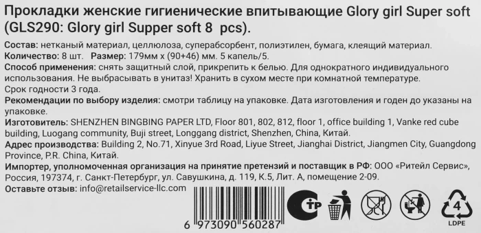 Прокладки GLORY GIRL ночные для критических дней, с крыльями, с высокой впитывающей способностью, в индивидуальной упаковке. Волнистая поверхность уменьшает площадь соприкосновения с кожей. Особое тиснение позволяет прокладке легко повторять контуры тела. Ультратонкое волокно быстро пропускает влагу и надежно закрепляет ее во внутренних слоях прокладки. Удобство и свежесть в любой день. Состав: Нетканый материал, целлюлоза, суперабсорбент, полиэтилен, бумага, клеящий материал. В упаковке 110x50x90 мм (ДxШxВ) Вес упаковки 80 г