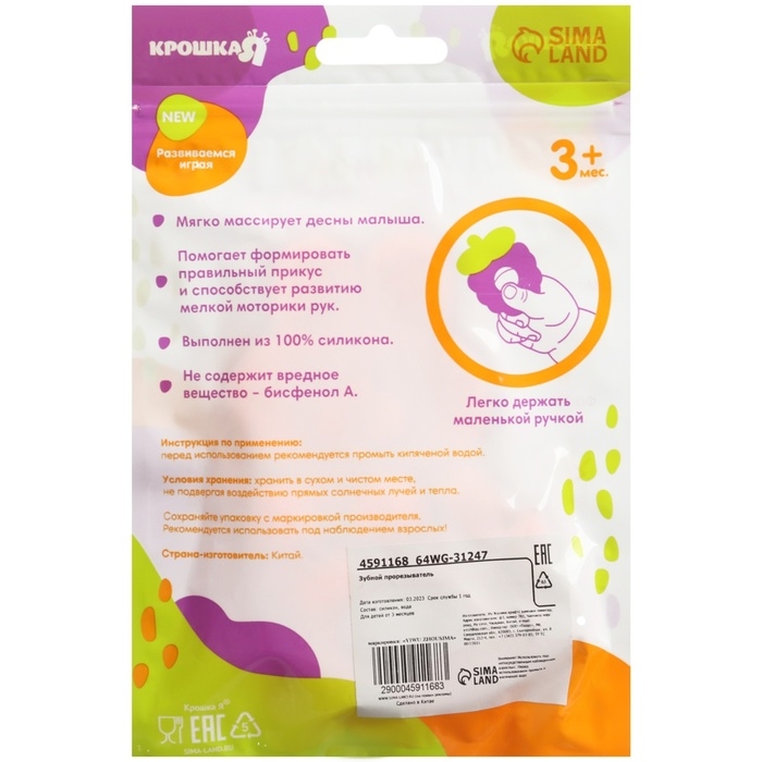 Специальная жидкость внутри поможет снизить воспаление в ротовой полости и снять болевые ощущения. Для охлаждения прорезывателя поместите его в холодильник на 10‒15 минут. Форма ручки и размеры разработаны специально для детской ладони, поэтому малышу будет удобно её держать. Рельефная структура на поверхности изделия и его дополнительных элементов будет способствовать развитию мелкой моторики, а яркие цвета — формированию визуального восприятия мира.