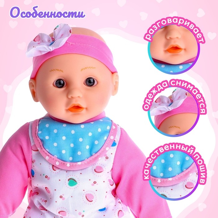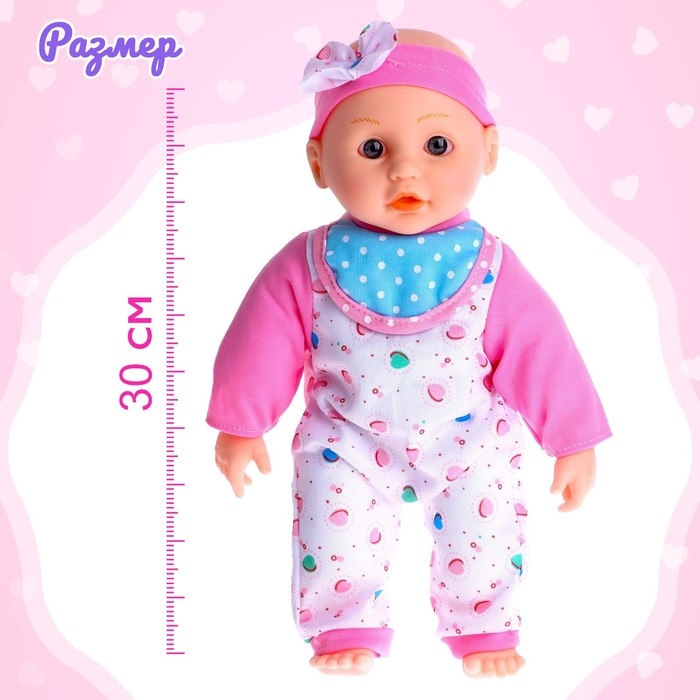 Пупс обязательно понравится ребёнку. Для работы игрушки нужны 3 батарейки типа LR44 (V13GA, AG13, LR1154), которые входят в комплект. Высота пупса: 30 см. Одежда снимается.
