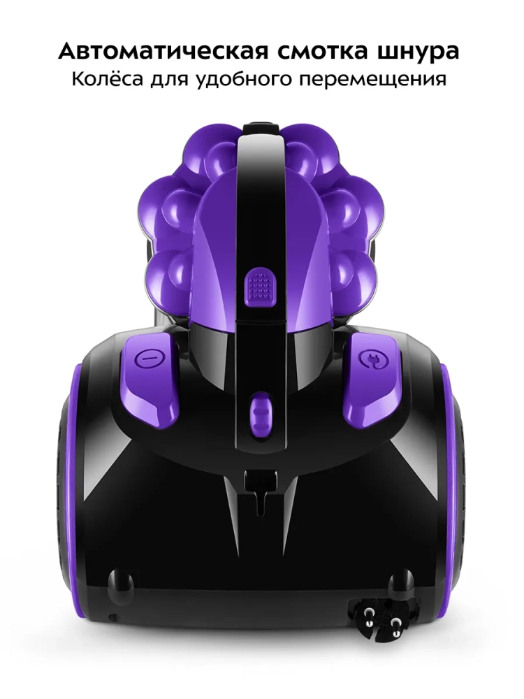 Пылесос оснащен колесами для легкого перемещения во время уборки. Длина телескопической трубки регулируется. В устройстве предусмотрена автоматическая смотка шнура в корпус прибора, поэтому шнур питания не будет мешать при хранении.