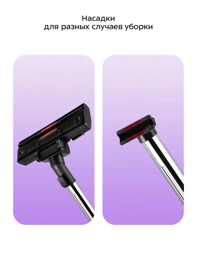 К пылесосу идет комплект насадок для разных случаев уборки. Щетка для пола имеет педаль для быстрого переключения между чисткой ковровых и гладких напольных покрытий. Это очень удобно, так как устраняет необходимость прерывания уборки, чтобы сменить насадку.