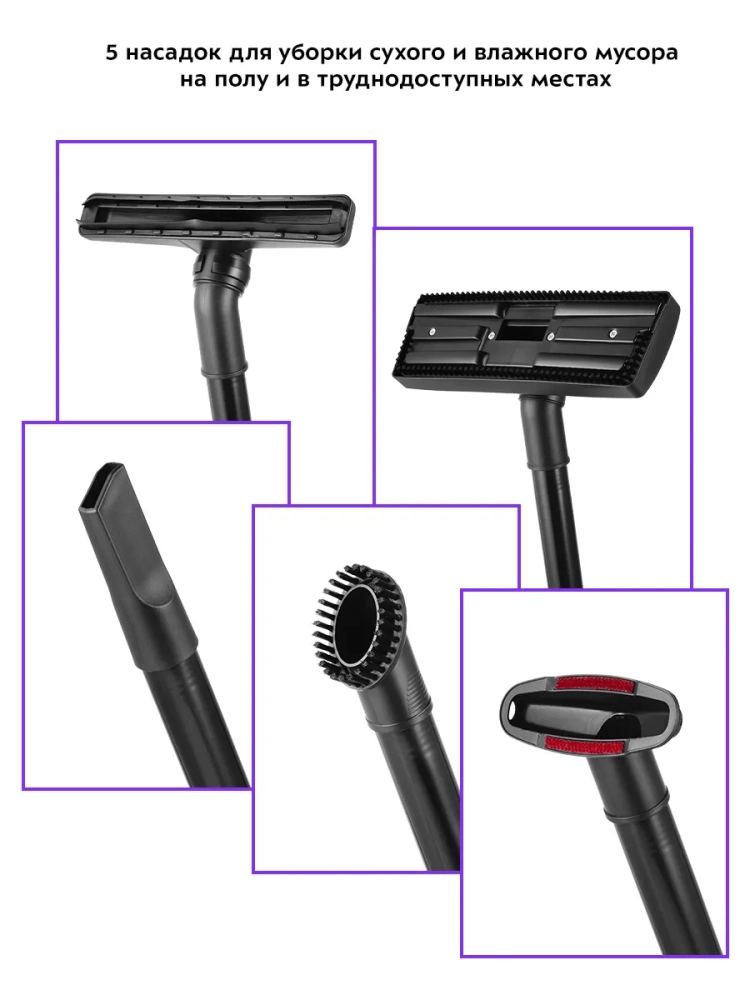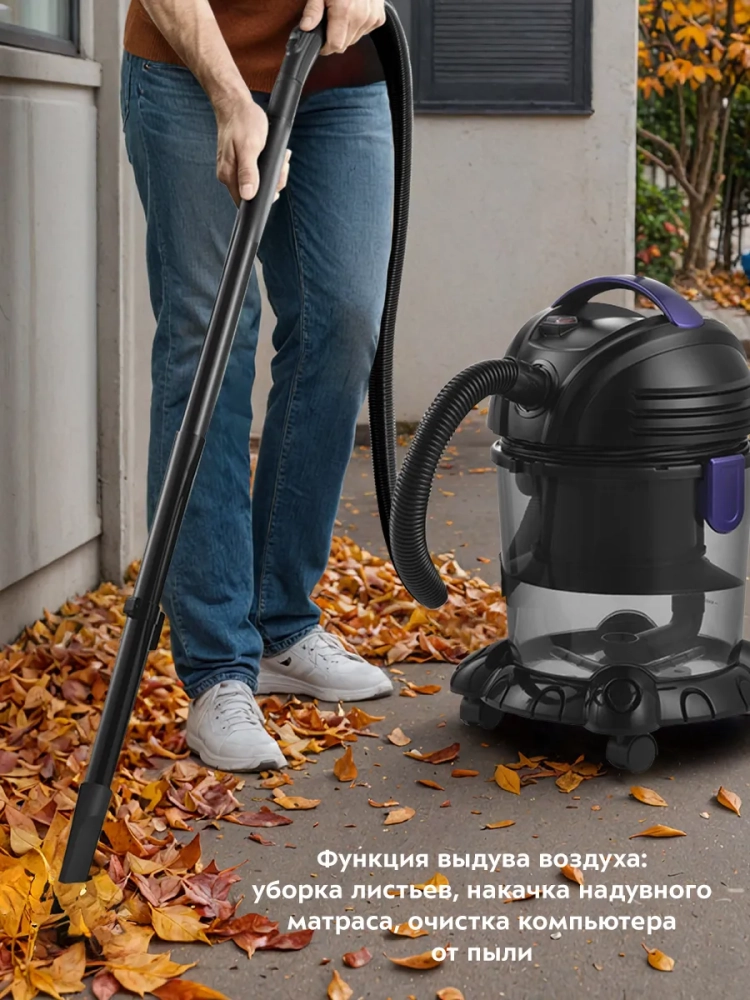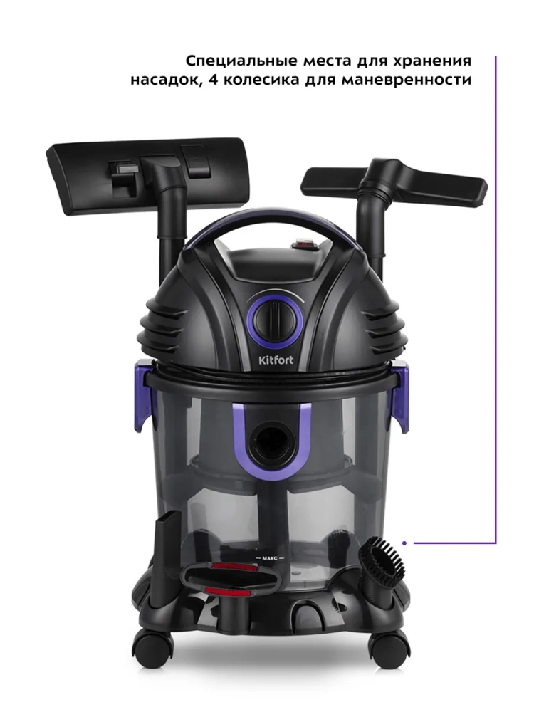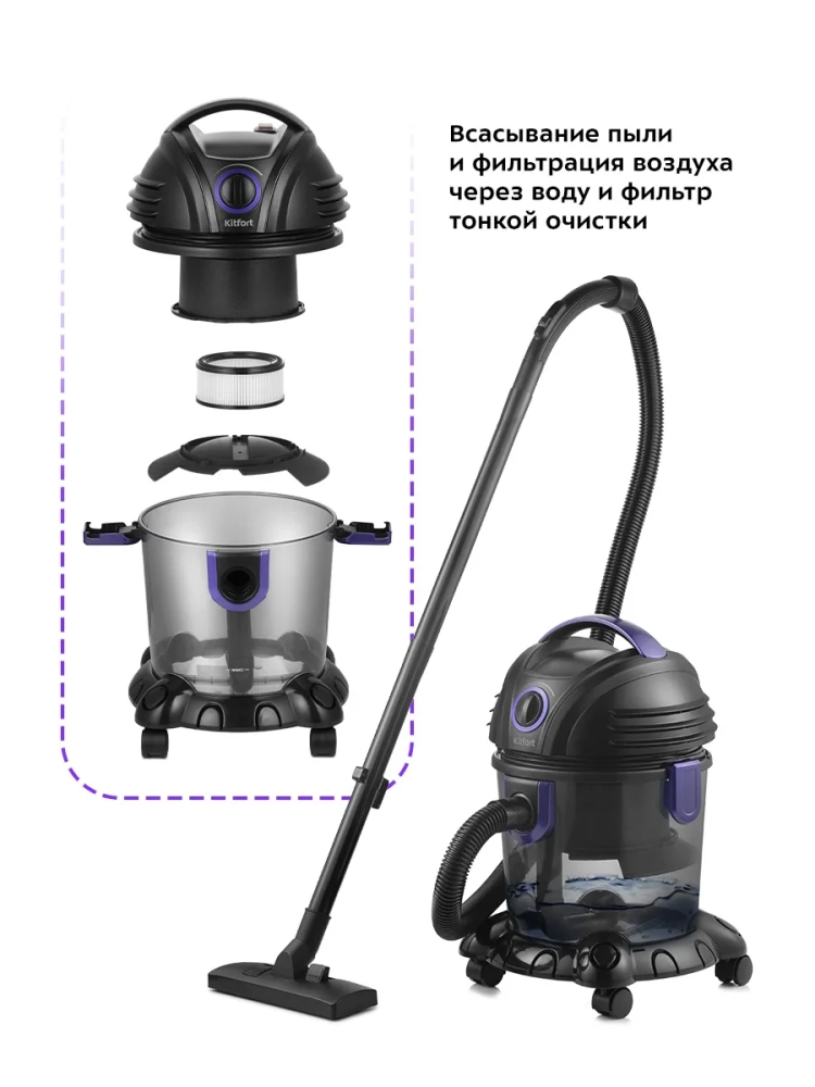 Пылесос Kitfort KT-5144 предназначен для влажной и сухой уборки. Пылесос собирает жидкости и грязь с поверхностей в пылесборник объемом 3,8 л. Благодаря функции влажной уборки можно собирать любые жидкости с пола и других поверхностей, также можно очищать душевые кабины и ванны. Для сухой уборки в резервуар для воды заливают воду. Вся пыль и грязь проходят фильтрацию через воду и фильтр тонкой очистки, благодаря чему выдуваемый воздух чистый. Это может быть особенно важно для аллергиков. Благодаря резервуару для воды, куда собирается вся грязь, пылесос очень удобно чистить после уборки — просто снимите моторный блок и вылейте грязную воду. Конструкция пылесоса без мешков для сбора пыли позволяет сохранять постоянную силу всасывания, легко очищать пылесос и не покупать мешки. Фильтр тонкой очистки можно мыть, поэтому срок службы такого фильтра очень долгий - его рекомендуют менять всего 1 раз в год. Функция выдува воздуха позволяет легко и быстро убрать листья с придомовой территории, накачать надувную кровать или матрас, почистить компьютер и комплектующие. Пылесос оснащен 4 колесиками - его легко возить за собой во время уборки. Длинный шнур обеспечивает удобство при уборке - можно не переключать пылесос из розетки в розетку, перемещаясь по дому.