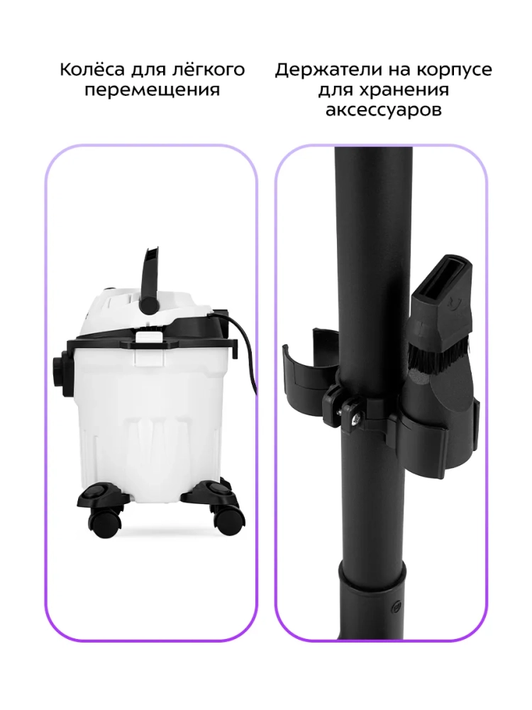 Устройство оснащено колесами для легкого перемещения во время уборки и ручкой для переноски. Специальные держатели на корпусе позволяют компактно и удобно хранить все необходимые аксессуары под рукой.