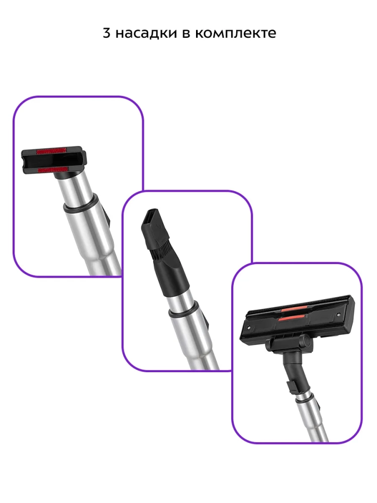 В комплекте к пылесосу идет комплект насадок для разных случаев уборки. Щетка для пола имеет педаль для быстрого переключения между чисткой ковровых и гладких напольных покрытий. Это очень удобно, так как нет необходимости прерывать уборку, чтобы сменить насадку.