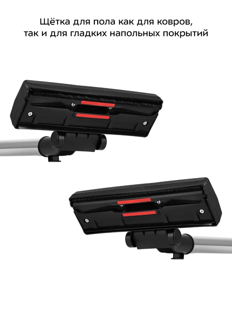 В комплекте к пылесосу идет комплект насадок для разных случаев уборки. Щетка для пола имеет педаль для быстрого переключения между чисткой ковровых и гладких напольных покрытий. Это очень удобно, так как нет необходимости прерывать уборку, чтобы сменить насадку.