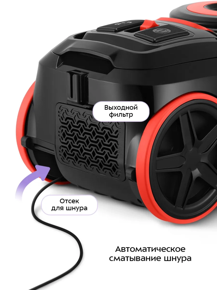 Пылесос оснащен колесами для легкого перемещения во время уборки. Длина телескопической трубки регулируется. В устройстве предусмотрена автоматическая смотка шнура в корпус прибора, поэтому шнур питания не будет мешать при хранении.
