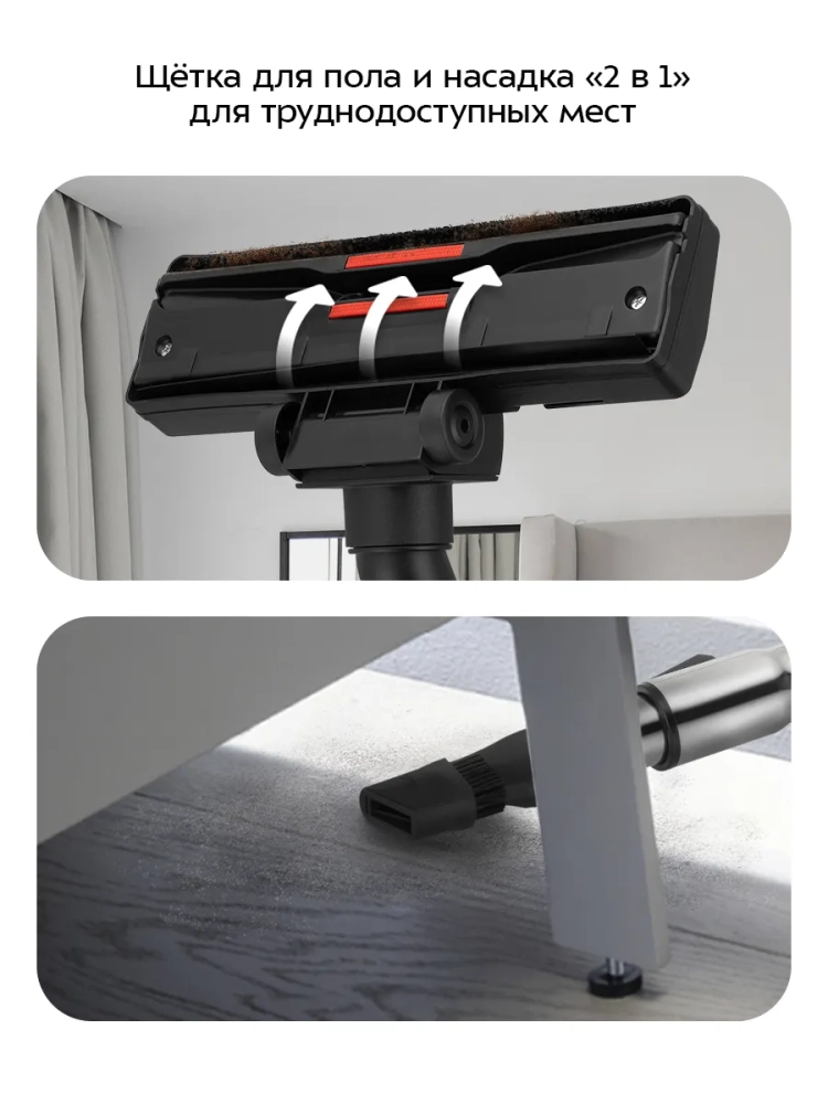Насадка «2 в 1» сочетает в себе узкую насадку для труднодоступных мест и ворсовую щетку для очистки поверхностей от пыли, шерсти, волос и ворса.