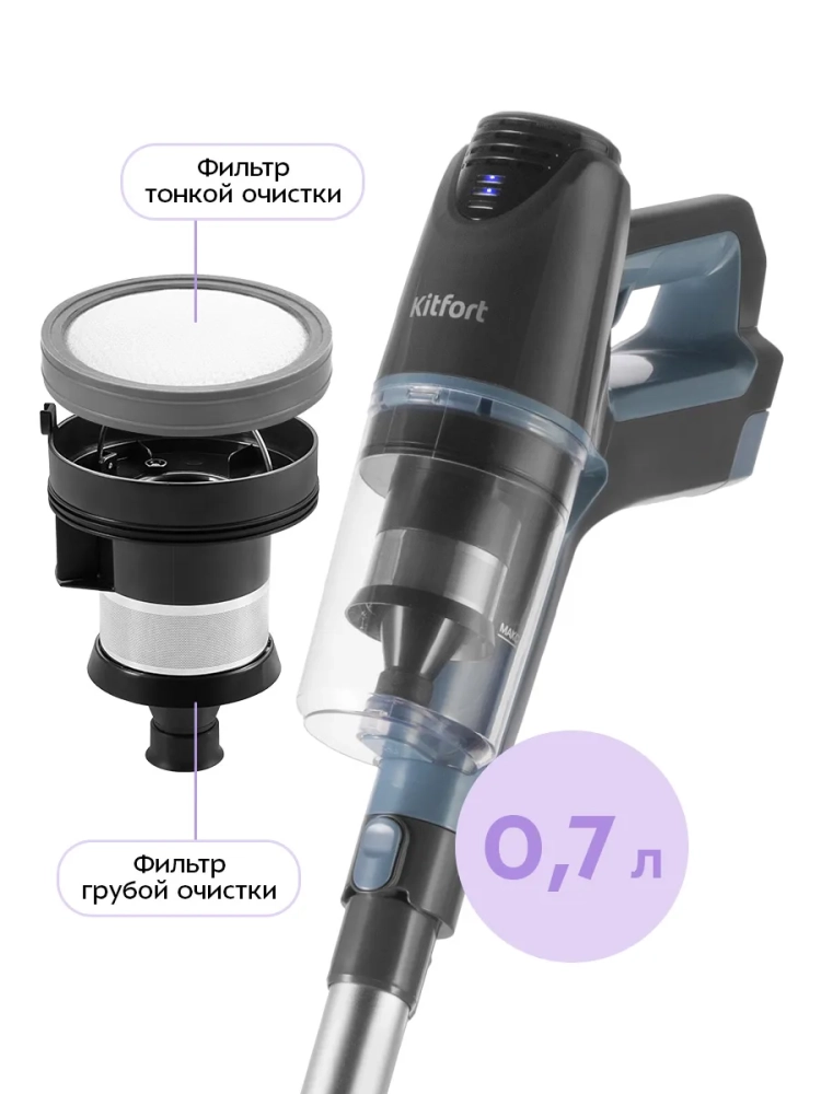 Беспроводной вертикальный пылесос Kitfort КТ-5355 очень удобен для проведения уборки. Он компактен, всегда под рукой и готов к работе. При отсоединении удлинительной трубки и установке насадок он превращается в ручной пылесос. Его конструкция позволяет легко проникать в самые труднодоступные уголки квартиры. При этом не нужно передвигать громоздкий корпус проводного пылесоса и управляться с непослушным шлангом. Благодаря работе от аккумулятора не нужно включать вилку в розетку, провода не мешают под ногами, поэтому пылесос имеет неограниченный радиус действия: от любого уголка квартиры до машины или беседки в саду. Пылесос оснащен маневренной напольной щеткой, которая вращается в двух плоскостях благодаря специальному шарниру.