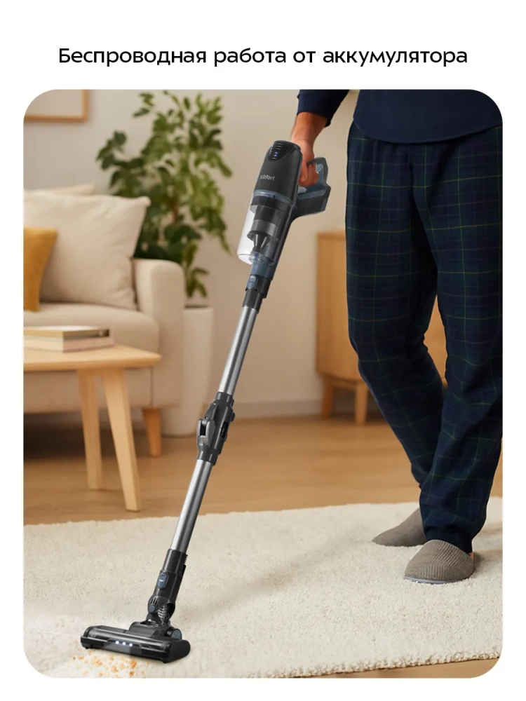 Одно из главных достоинств вертикального пылесоса — его компактность и маневренность. Пылесос поможет вам убраться в узком коридоре или комнате, заполненной мебелью и предметами. Для удобства хранения в комплекте поставляется кронштейн, который крепится к стене. Для владельцев небольших квартир, которые сталкиваются с проблемой хранения бытовых приборов, приобретение этой модели будет оптимальным вариантом.