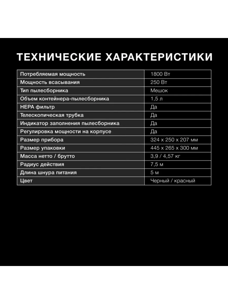 Hyundai HYV-B1570 имеет функцию работы с мешком для пыли. Один присутствует в комплекте поставки. Объём пылесборника девайса составляет 1,5 л – его хватает на несколько уборок. Также этот набор включает руководство по эксплуатации полностью на русском языке.