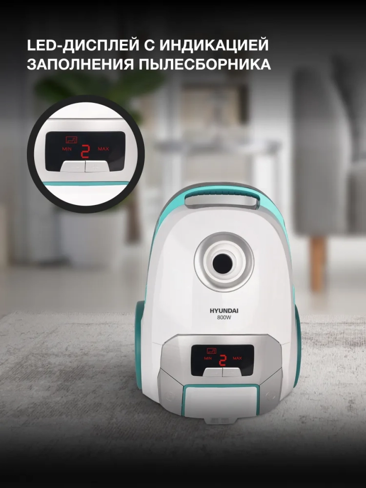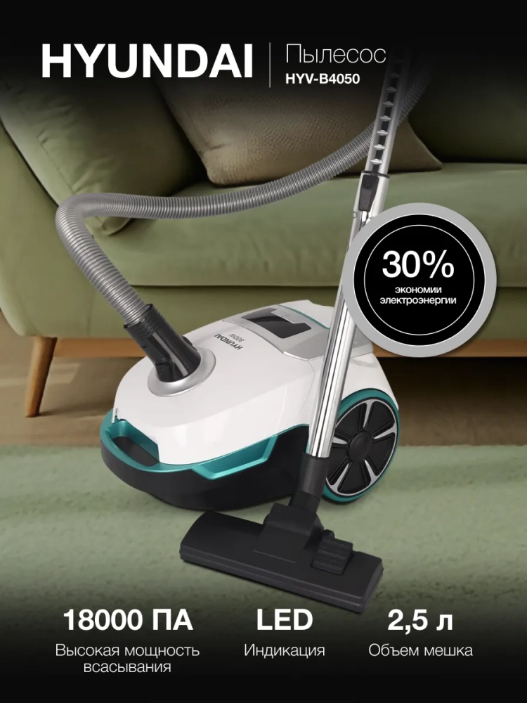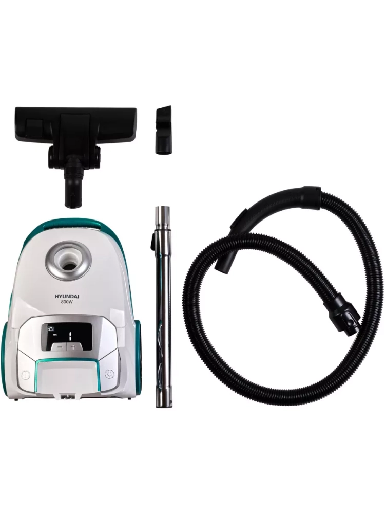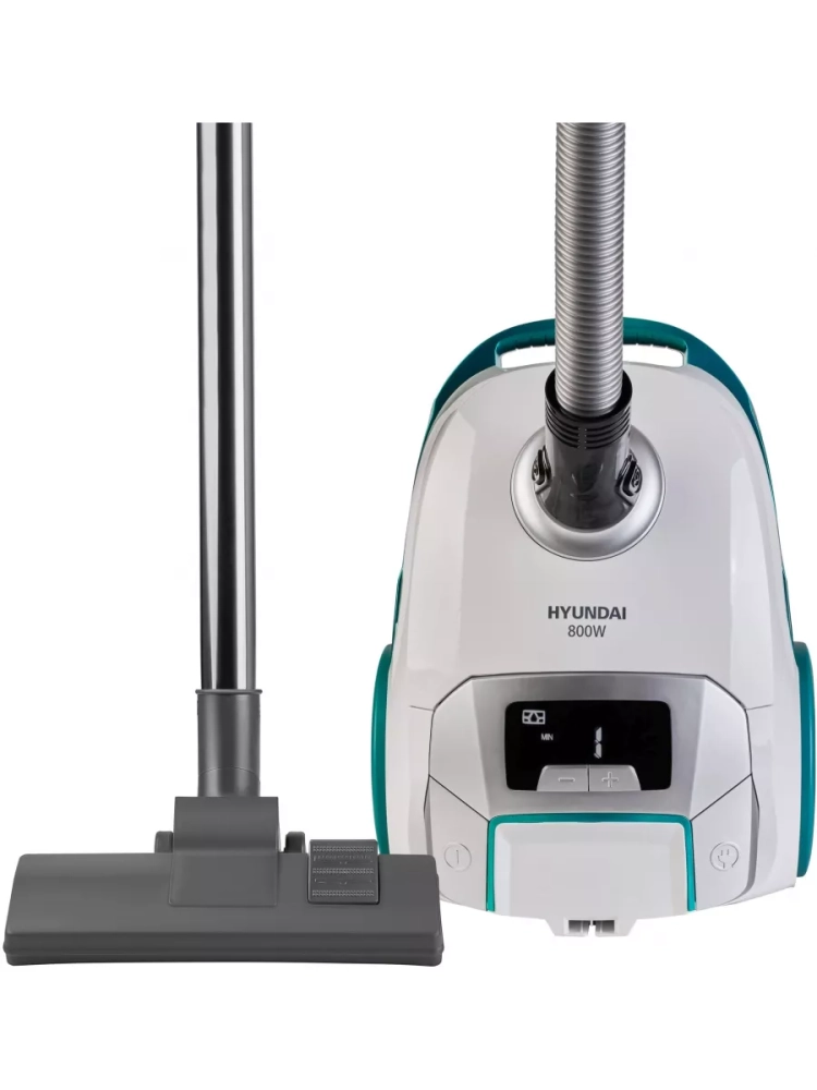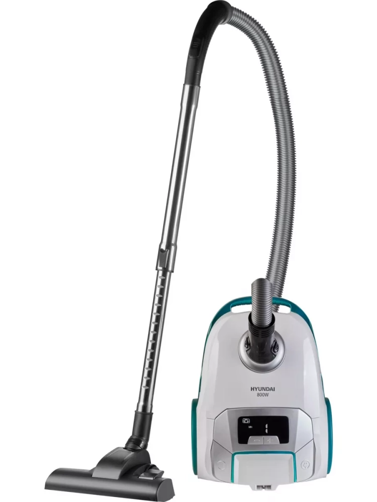 Пылесос Hyundai HYV-B4050 белый/бирюзовый, мощность 800Вт, уборка: сухая, объем пылесборника 2.5л, мощность всасывания 250Вт, регулировка мощности на корпусе, длина шнура 5м.