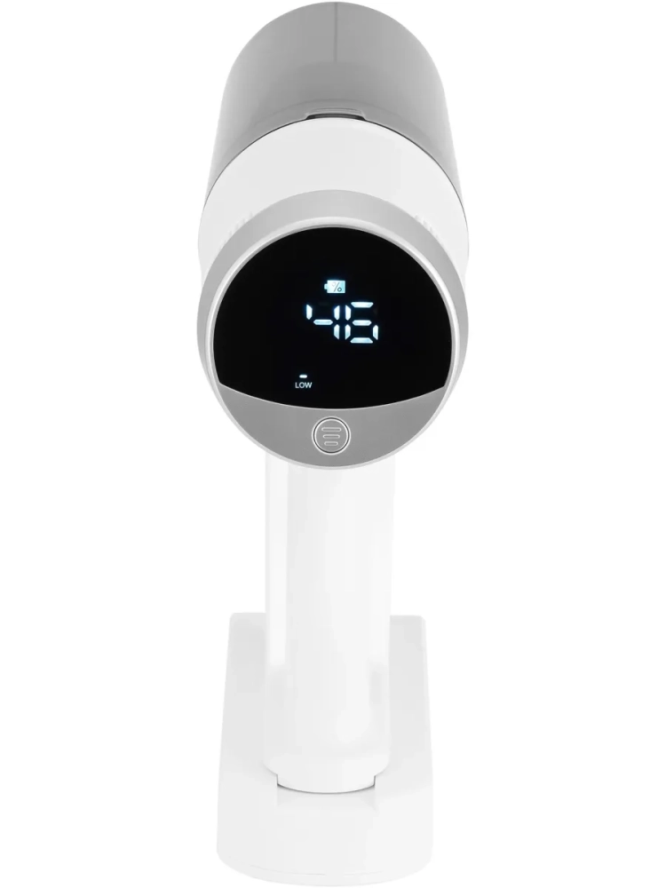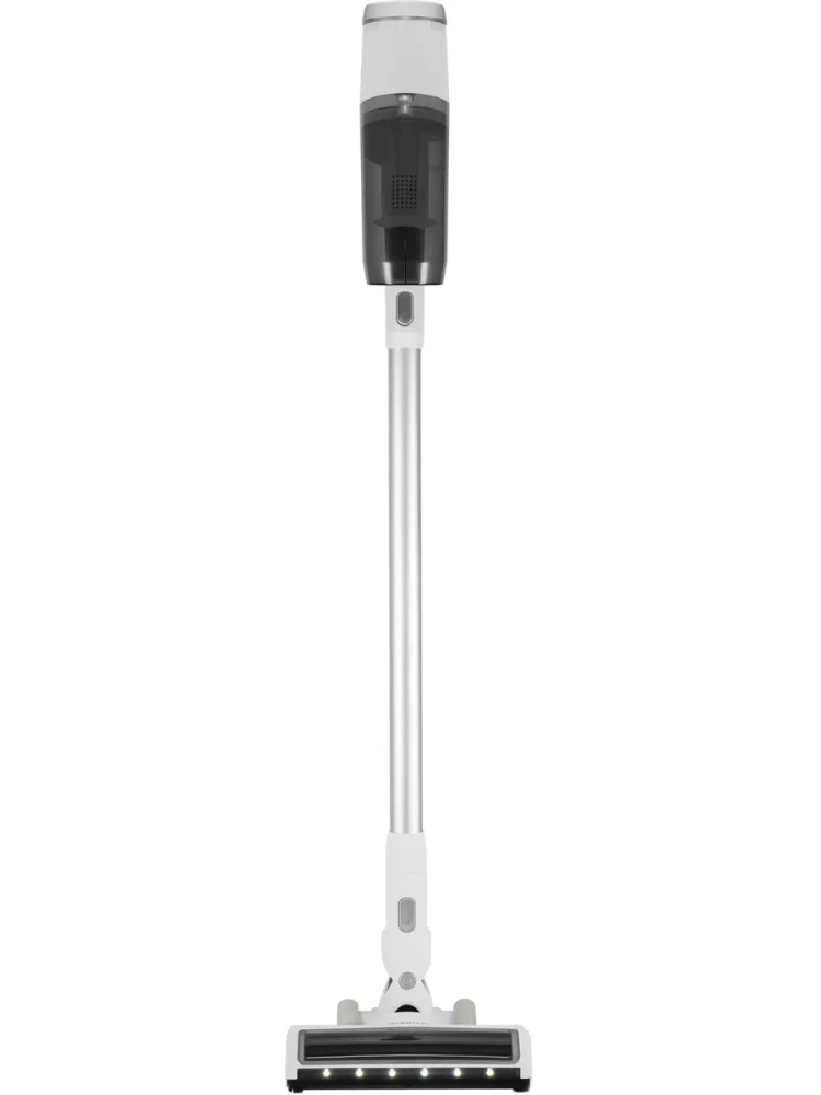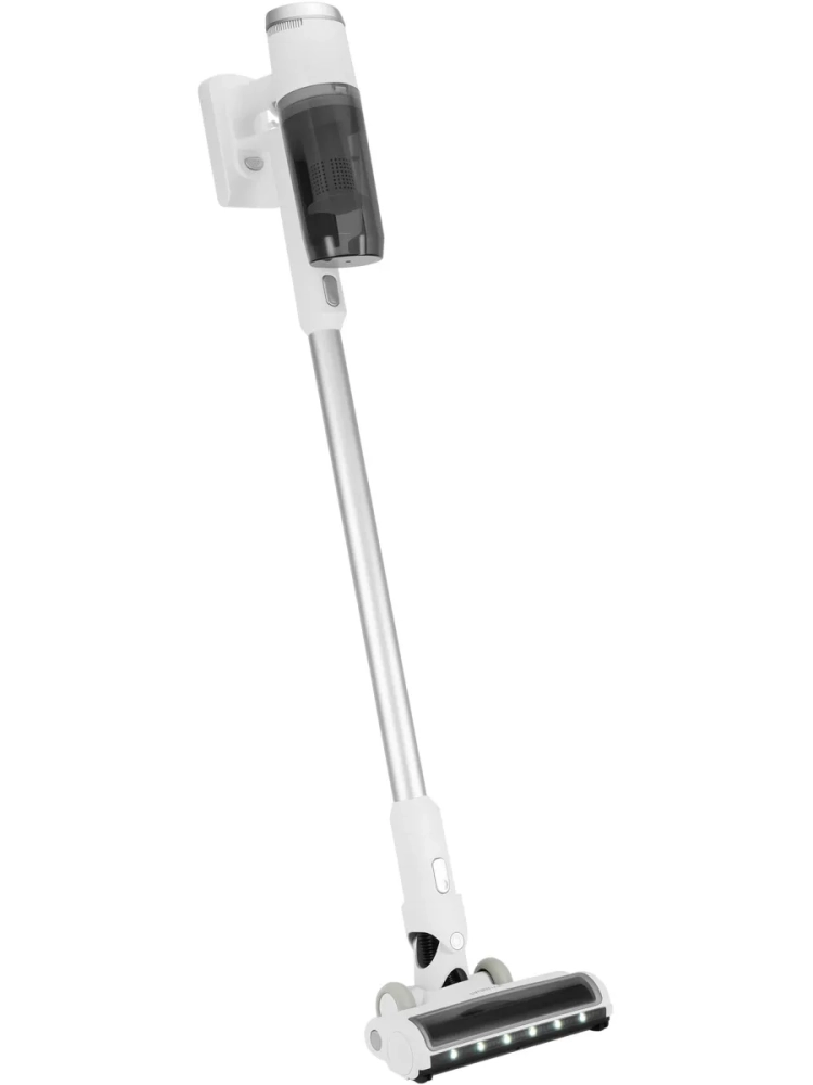 Управление интуитивно понятно и оснащено системой световой индикации, которая отображает режим работы, степень заряда и предупреждает о возможных застреваниях. Для удобства хранения предусмотрено настенное крепление. Корпус выполнен в стильном белом цвете с серебристыми акцентами.