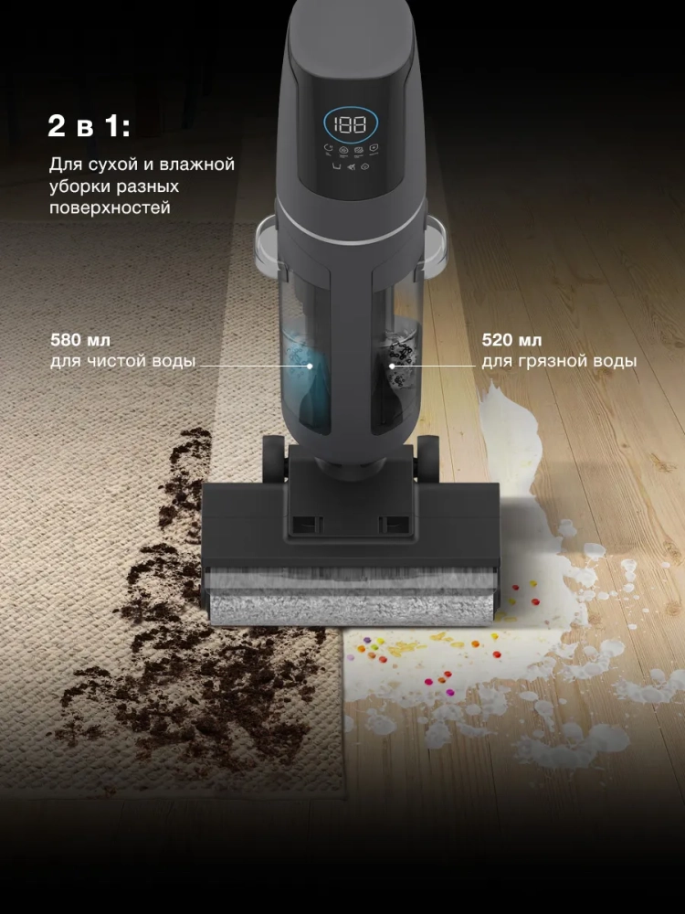 • 2-в-1: сухая и влажная уборка – универсальное решение для любых поверхностей.