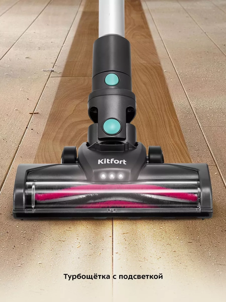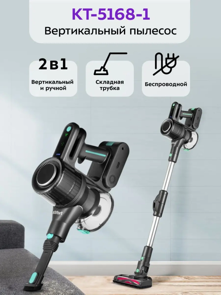 Беспроводной вертикальный пылесос Kitfort КТ-5168 очень удобен при локальной и генеральной уборке. Он компактен, всегда под рукой и готов к работе. При отсоединении удлинительной трубки и установке насадки он превращается в ручной пылесос. У данного пылесоса складная трубка — такая конструкция позволяет легко проникать в самые труднодоступные уголки квартиры.