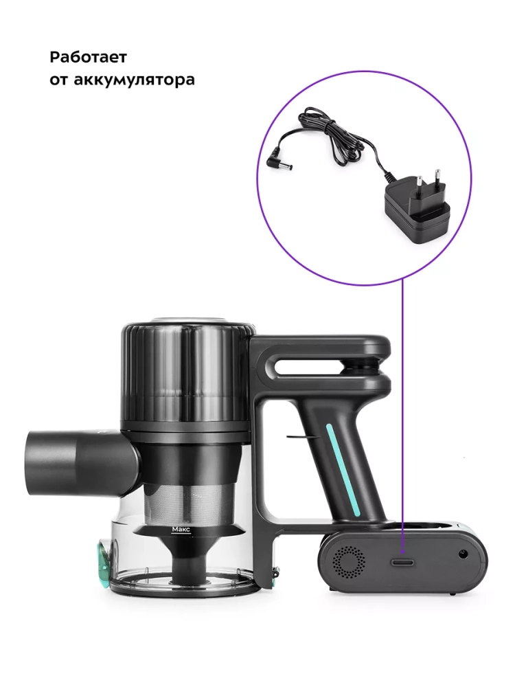 Благодаря работе от аккумулятора не нужно включать вилку в розетку, провода не мешают под ногами. Поэтому пылесос имеет неограниченный радиус действия: от любого уголка квартиры до машины или беседки в саду. Пылесос оснащен маневренной напольной щеткой, которая вращается в двух плоскостях.