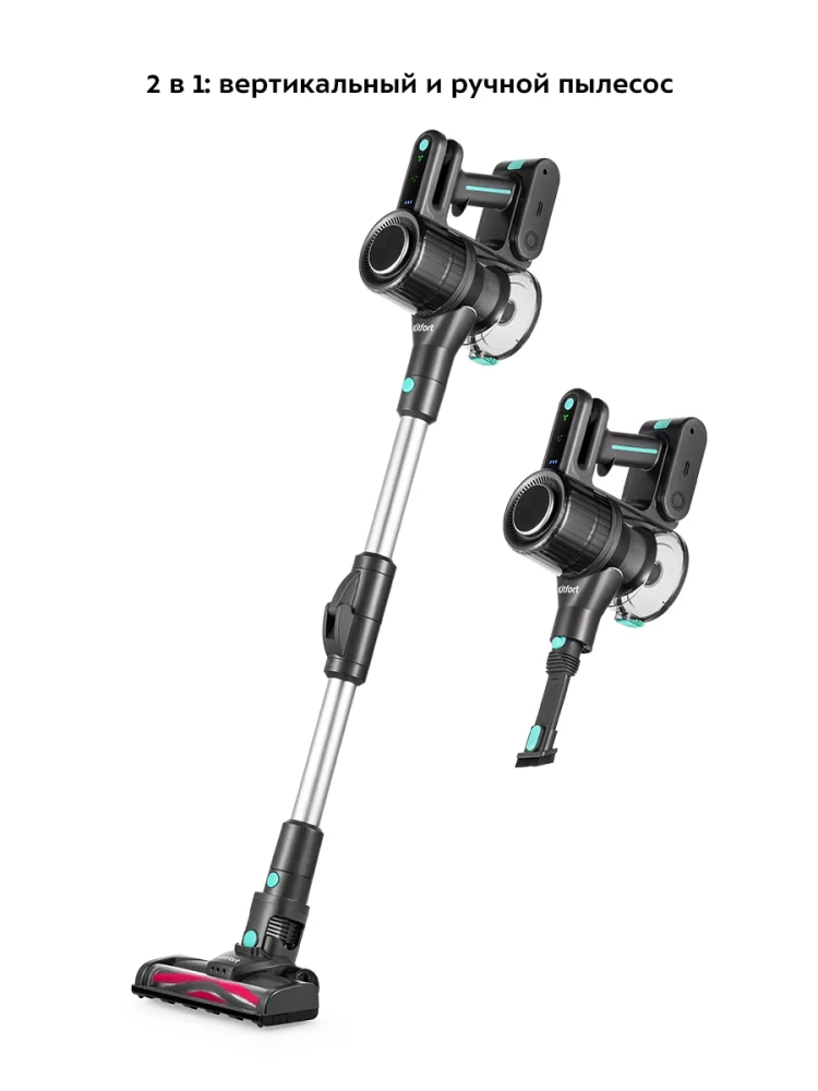 Конструкция «2 в 1» предусматривает наличие ручного пылесоса, который удобно использовать отдельно. Ручным пылесосом можно пропылесосить углы и плинтусы, обивку мебели, пыль со шкафов (куда обычным пылесосом очень трудно дотянуться из-за ограниченной длины шланга), шкафчики на кухне или в гостиной, книжные полки, коврики в автомобиле или багажник.