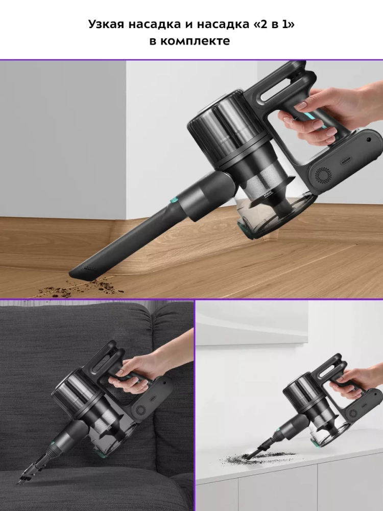 Пылесос комплектуется турбощеткой, которая качественно очищает гладкие поверхности и ковровые покрытия с коротким ворсом. Также к пылесосу прилагается насадка «2 в 1», узкая насадка для труднодоступных мест и кронштейн для настенного хранения устройства. Светодиодная подсветка на напольной щетке способствует более качественной уборке.