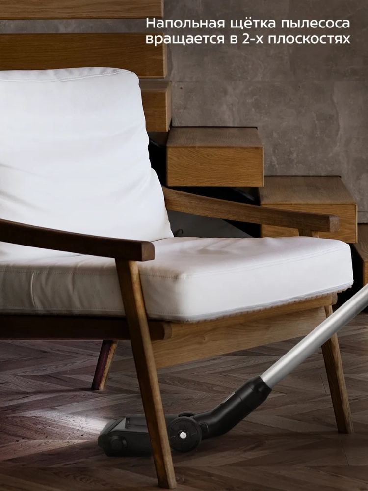 Пылесос комплектуется напольной турбощеткой с двумя валиками: мягким валиком для гладких поверхностей и валиком с щеткой для ковровых покрытий. Турбощетка помогает качественно справиться с очисткой гладких и ковровых напольных покрытий с не очень длинным ворсом. Светодиодная подсветка турбощетки сделает уборку комфортной даже в затемненных местах. Также к пылесосу прилагаются насадка «2 в 1», плоская насадка и кронштейн для настенного хранения устройства.