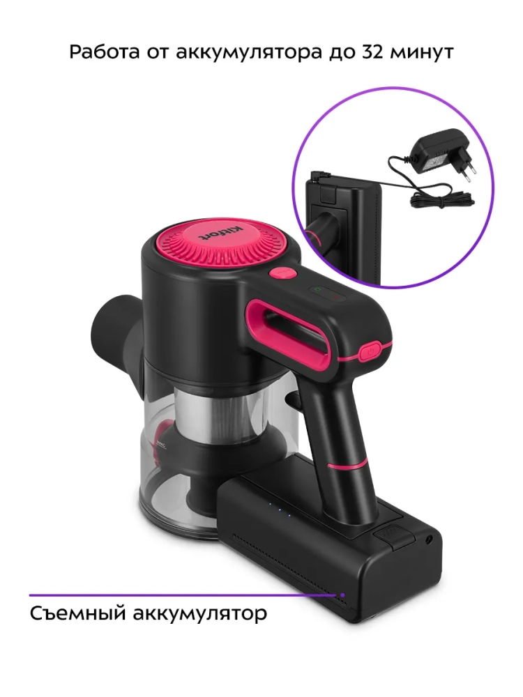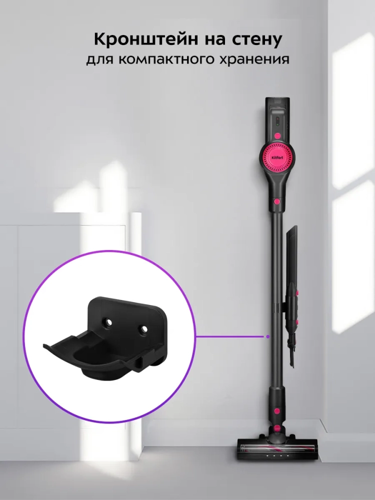 Беспроводной пылесос Kitfort оснащен аккумулятором, который обеспечивает длительное время работы без необходимости постоянной зарядки. Это позволяет использовать пылесос в любом уголке дома, не беспокоясь о длине провода. Вертикальный дизайн пылесоса делает его удобным для хранения в шкафу или на полке, а также для использования в труднодоступных местах, таких как под мебелью или в углах.